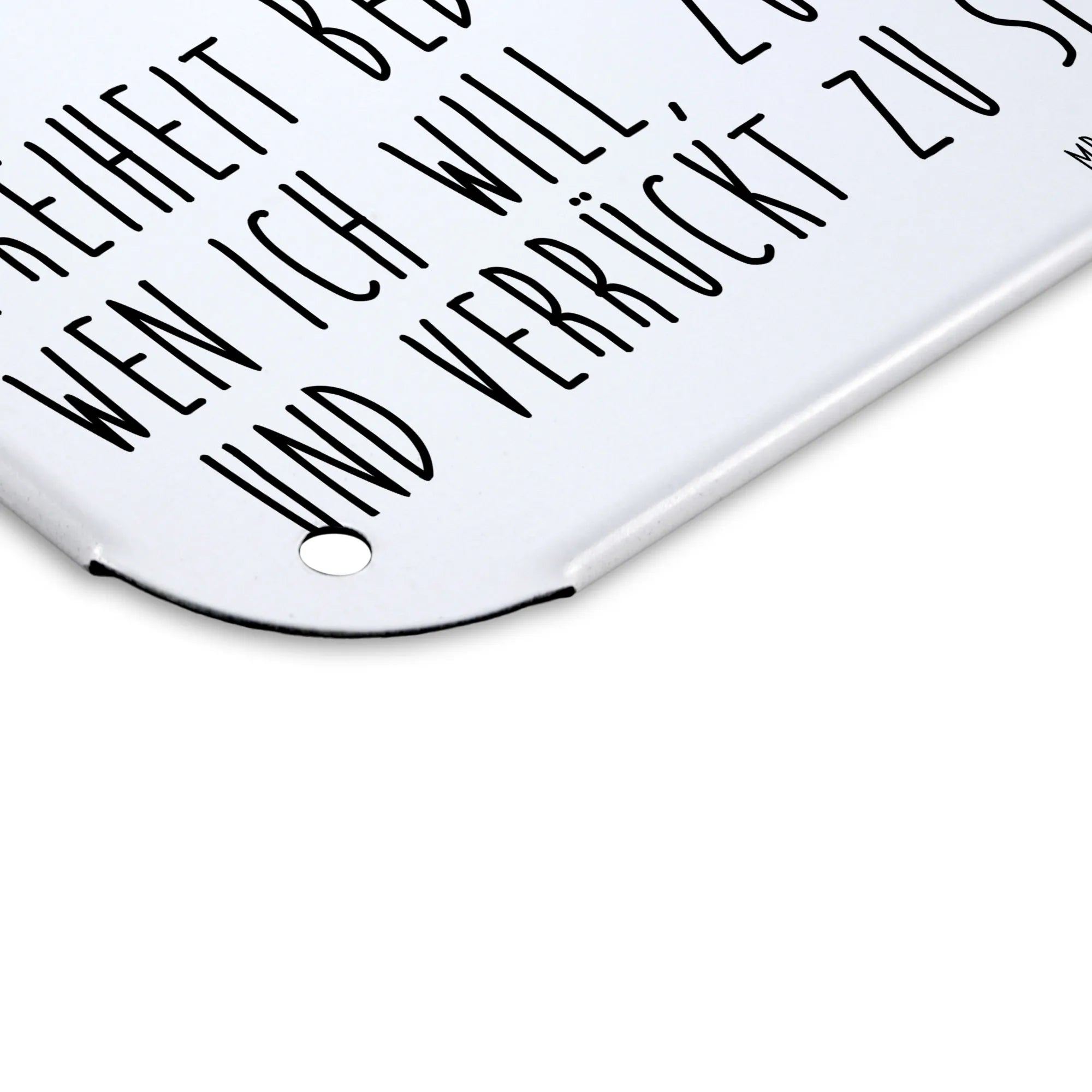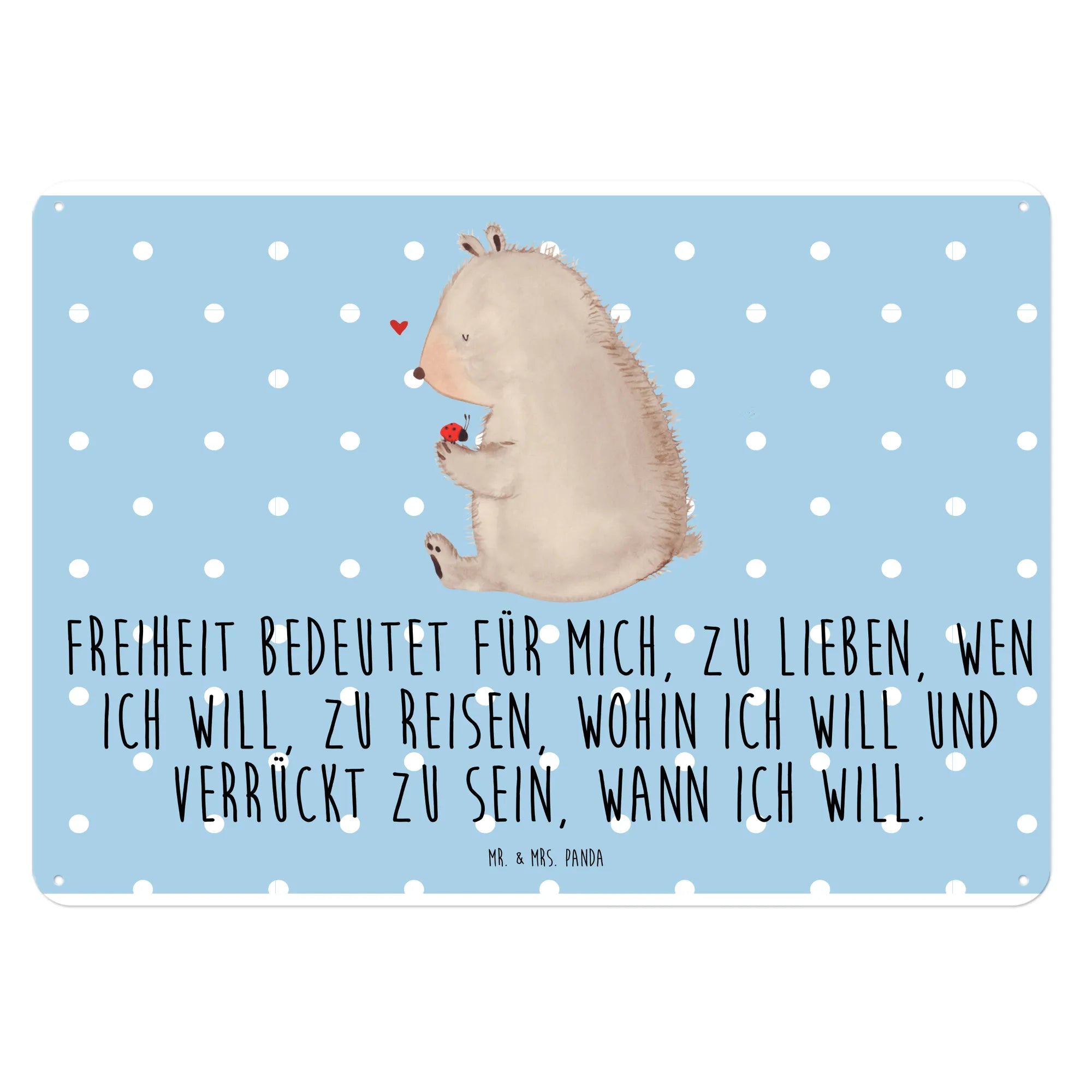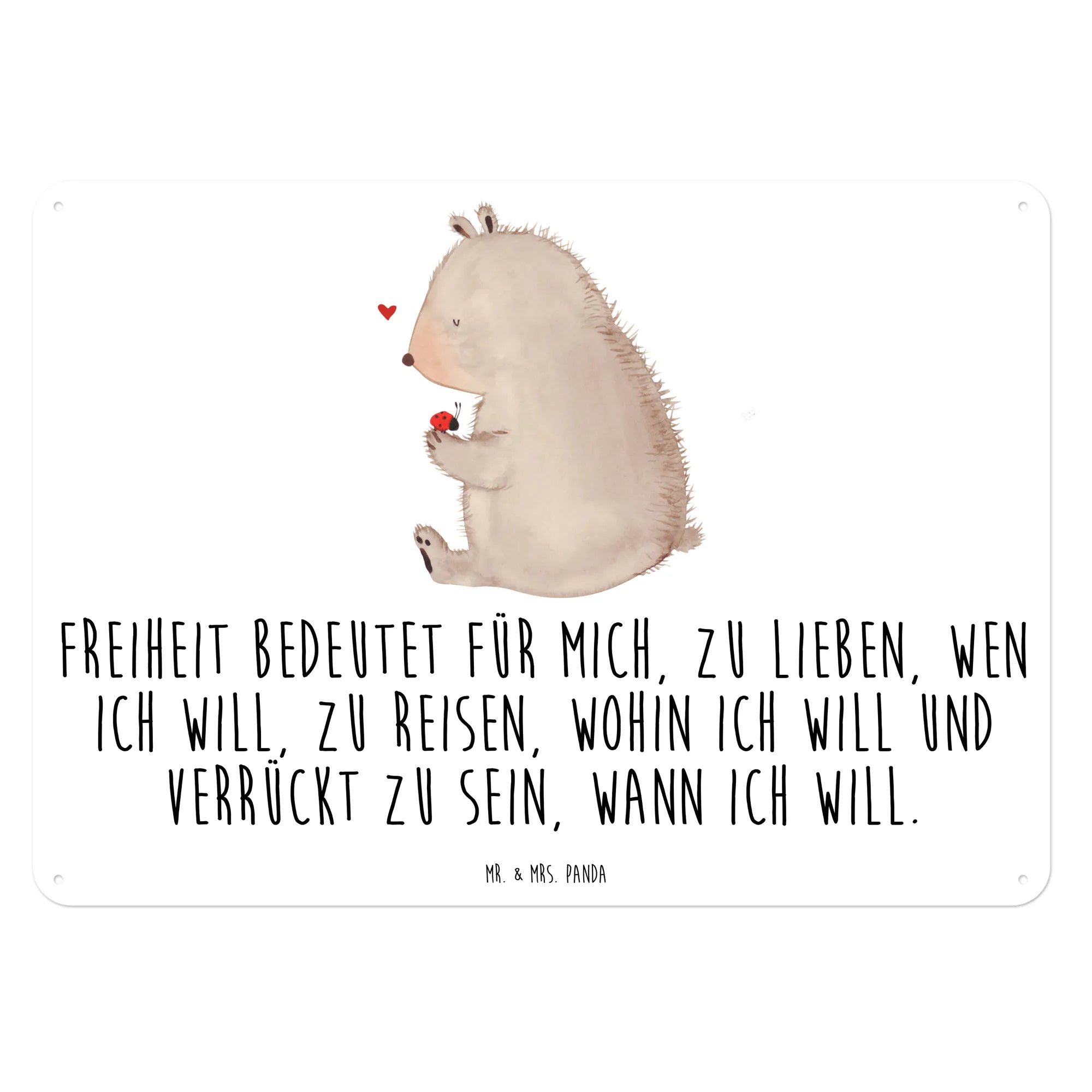 Das edle Blechschild mit dem süßen Bär und Marienkäfer Motiv von Mr. & Mrs. Panda ist das perfekte Geschenk für jeden, der eine liebevolle und positive Botschaft für sein Zuhause sucht. Mit den Maßen von 146 mm x 420 mm x 297 mm ist es ideal als Wanddekoration oder für die Tür geeignet. Die seidenmatte Oberfläche und die abgerundeten Ecken vermitteln einen eleganten Eindruck. Das Schild ist mit dem liebevollen Spruch "Freiheit bedeutet für mich, zu lieben, wen ich will, zu reisen, wohin ich will und verrückt zu sein, wann ich will" ausgestattet, was jedem Raum eine motivierende Note verleiht.
