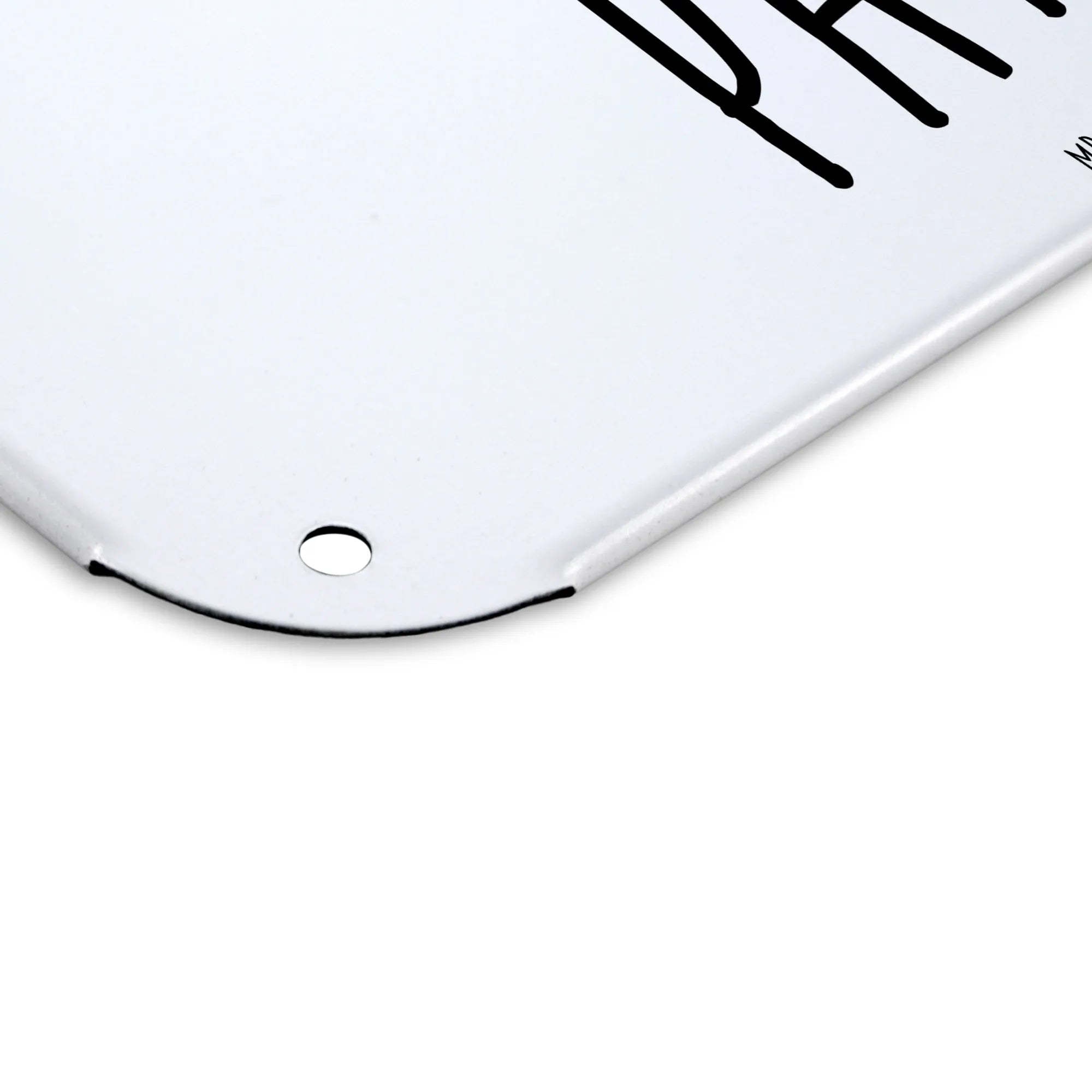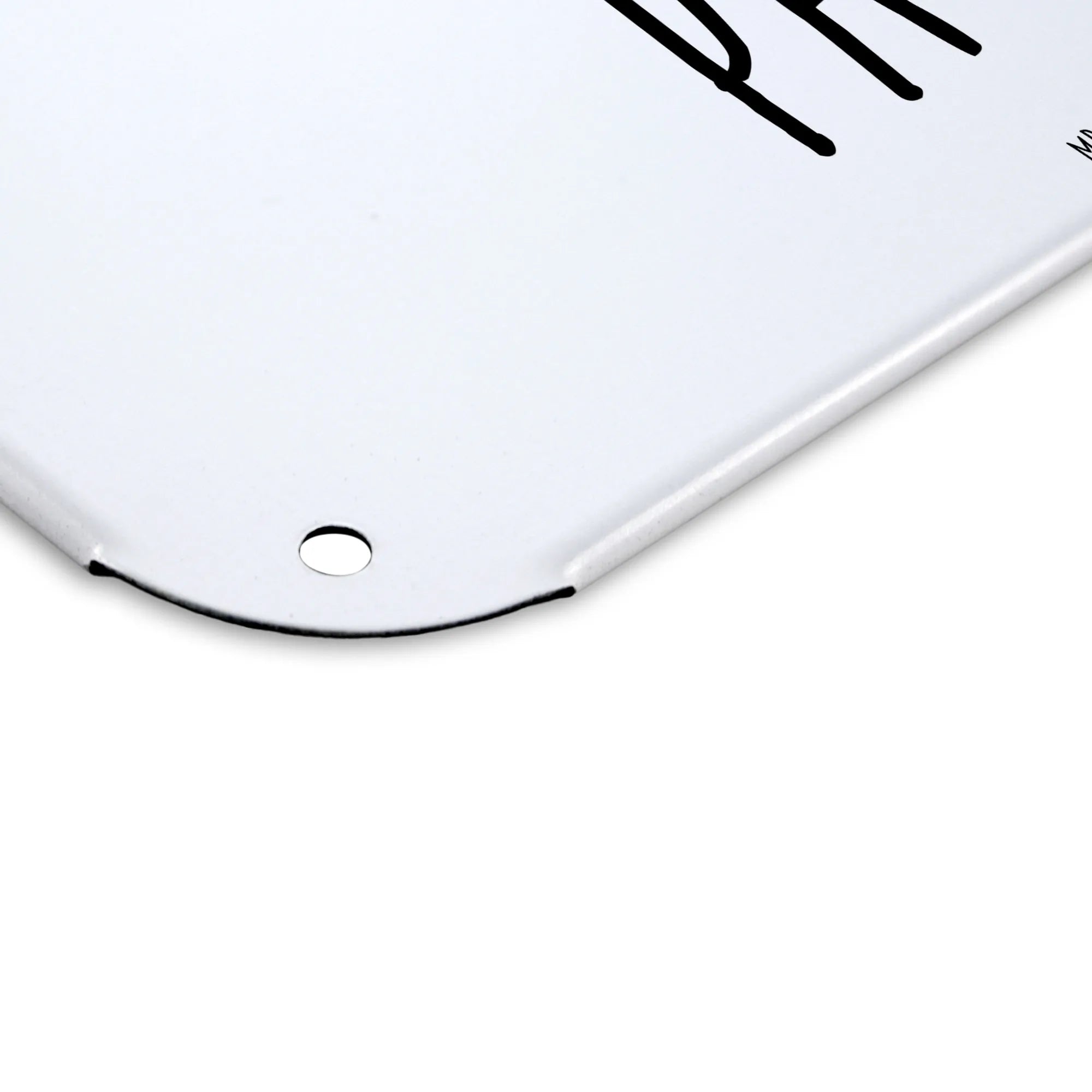 Mit den 4 Bohrungen kannst du das Schild einfach und sicher aufhängen oder anbringen. Die abgerundeten Ecken und umgefalteten Kanten sorgen dafür, dass es nicht nur hübsch aussieht, sondern auch sicher im Umgang ist.