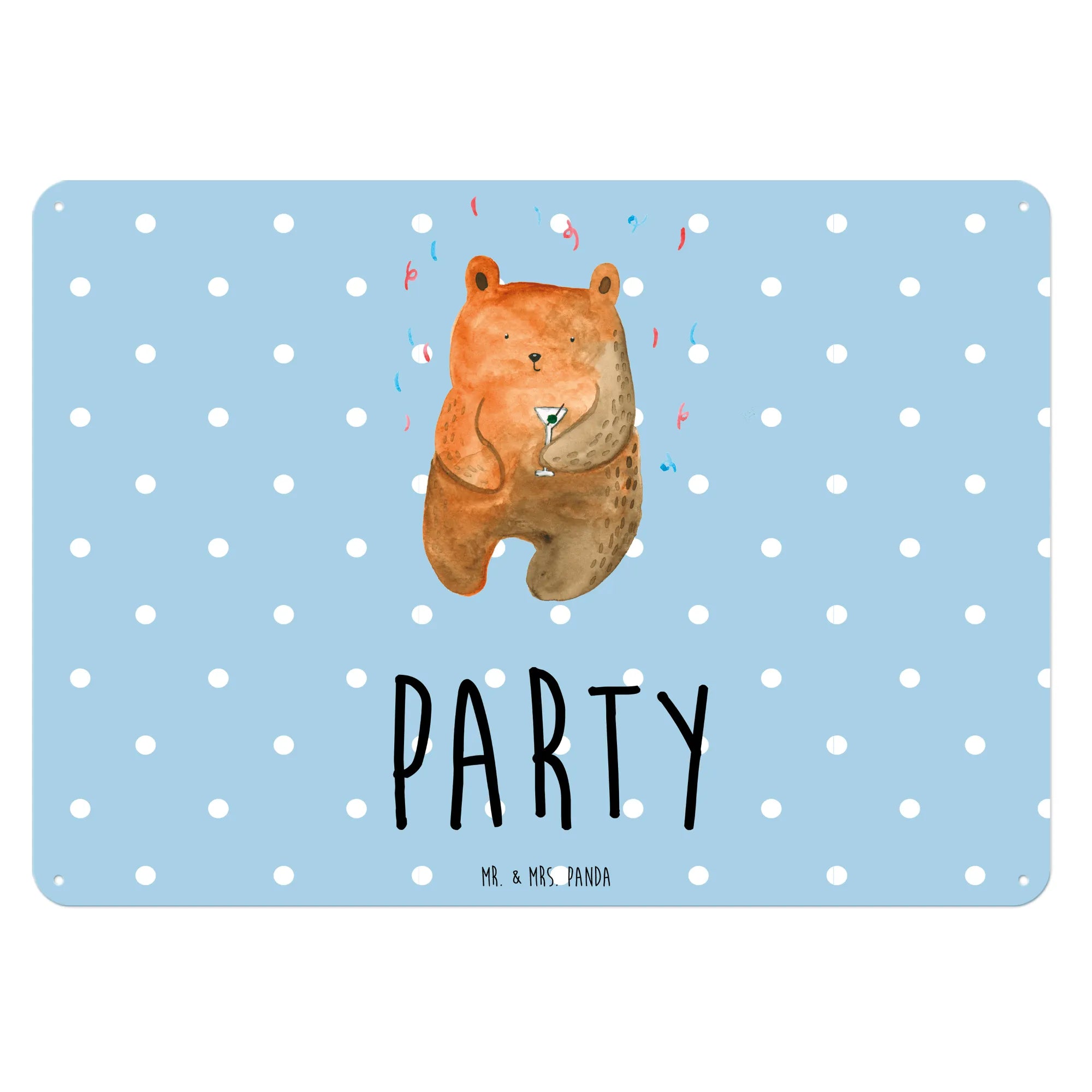 Das süße Blechschild "Bär Party" von Mr. & Mrs. Panda ist das perfekte Geschenk für jeden, der Bären und fröhliche Feiern liebt! Mit seinem charmanten Design, das einen fröhlichen Bären mit einem Partyhütchen zeigt, bringt es garantiert gute Laune in jedes Zuhause.
