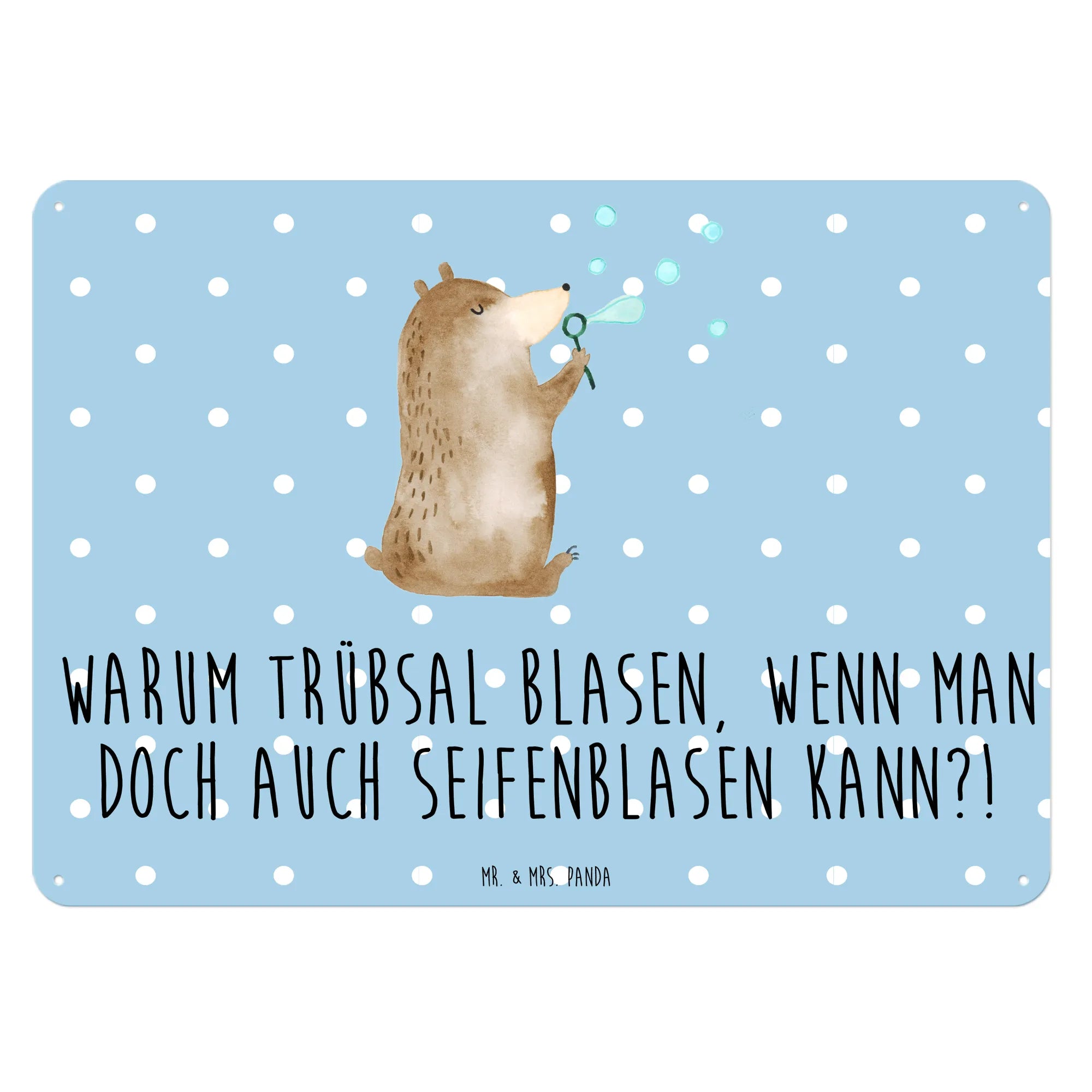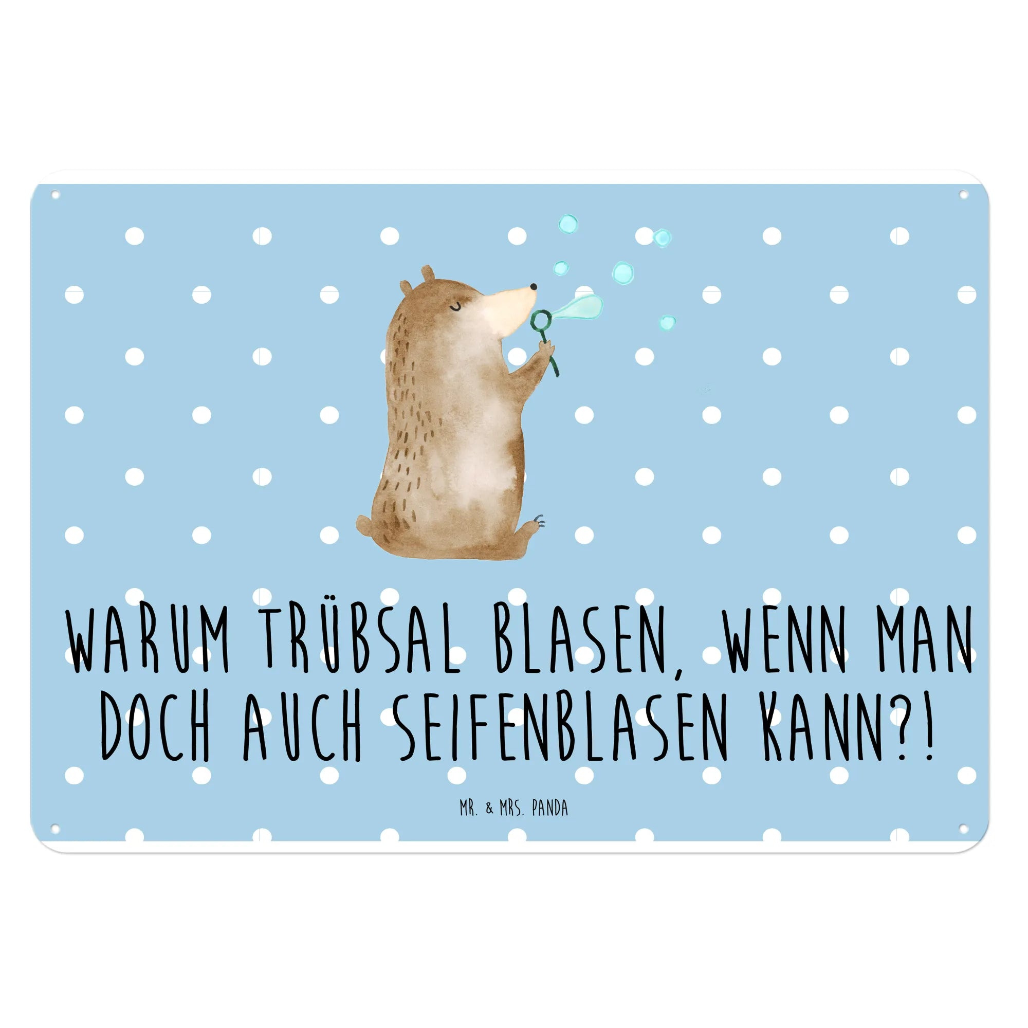 Entdecke unser wunderbares Blechschild "Bär Seifenblasen" aus der bezaubernden Bären-Kollektion von Mr. & Mrs. Panda! Dieses edle und langlebige Metallschild bringt Freude in jedes Zuhause. Der niedliche Bär bläst Seifenblasen und versprüht damit pure Lebensfreude. Der Spruch "Warum Trübsal blasen, wenn man doch auch Seifenblasen kann?!" auf dem Schild erinnert uns daran, dass es immer einen Grund zum Lächeln gibt.