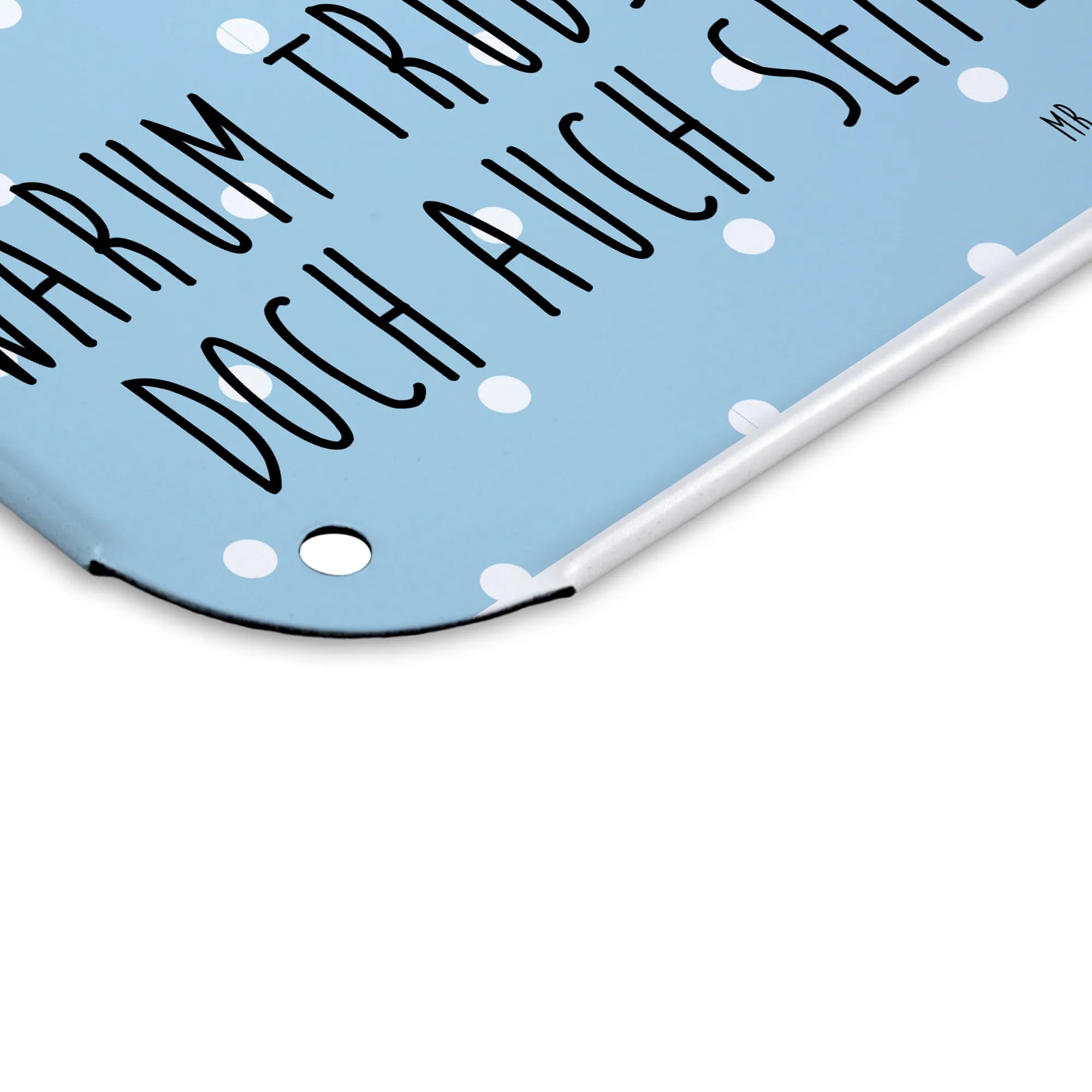 Das perfekte Stück für deine Wohnung: unser hochwertiges Blechschild von Mr. & Mrs. Panda! Mit den eindrucksvollen Maßen 146 mm x 148 mm x 105 mm, strahlt dieses Schild eine besondere Eleganz aus. Das edle Stahlblech ist doppelt beschichtet, sodass es langlebig und resistent gegen Verfärbungen bleibt. Der kreative Druck mit süßen Motiven und griffigen Sprüchen bringt Freude in jeden Raum und eignet sich hervorragend als Geschenkoption. Die seidenmatte Oberfläche wertet nicht nur das Schild selbst auf, sondern macht es auch zu einem zeitlosen Accessoire. Ob an der Wand oder der Tür - die Anbringung ist dank der 4 bereits vorgebohrten Löcher besonders einfach. Kanten und Ecken sind abgerundet und bilden somit ein sicheres Design für dein Zuhause. Dieses Blechschild passt perfekt in jeden Innenraum und lässt sich mühelos mit einem feuchten Tuch reinigen. Verfügbar in verschiedenen Größen, um sich harmonisch in dein Ambiente einzufügen.