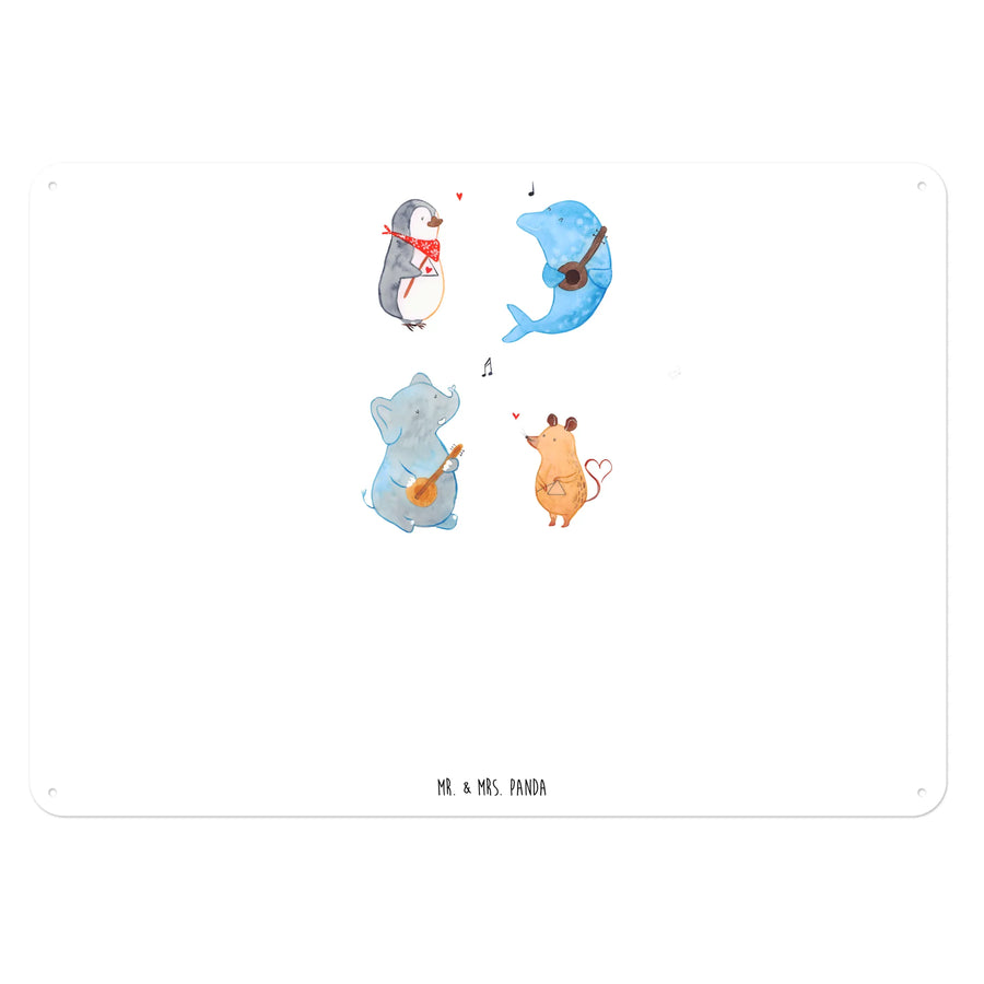 Das edle Blechschild mit dem fröhlichen Big Band Motiv von Mr. & Mrs. Panda ist das perfekte Geschenk für alle Musikliebhaber und Freunde der guten Laune. Mit einem süßen Pinguin, einer bezaubernden Maus, einem verspielten Delfin und einem charmanten Elefanten, die alle gemeinsam musizieren, zaubert dieses Schild jedem ein Lächeln ins Gesicht. Ob als Dekoration für die eigene Wand oder als originelles Türschild – dieses Metall-Schild bringt jede Menge Schwung in dein Zuhause und ist ideal für den Innenbereich.