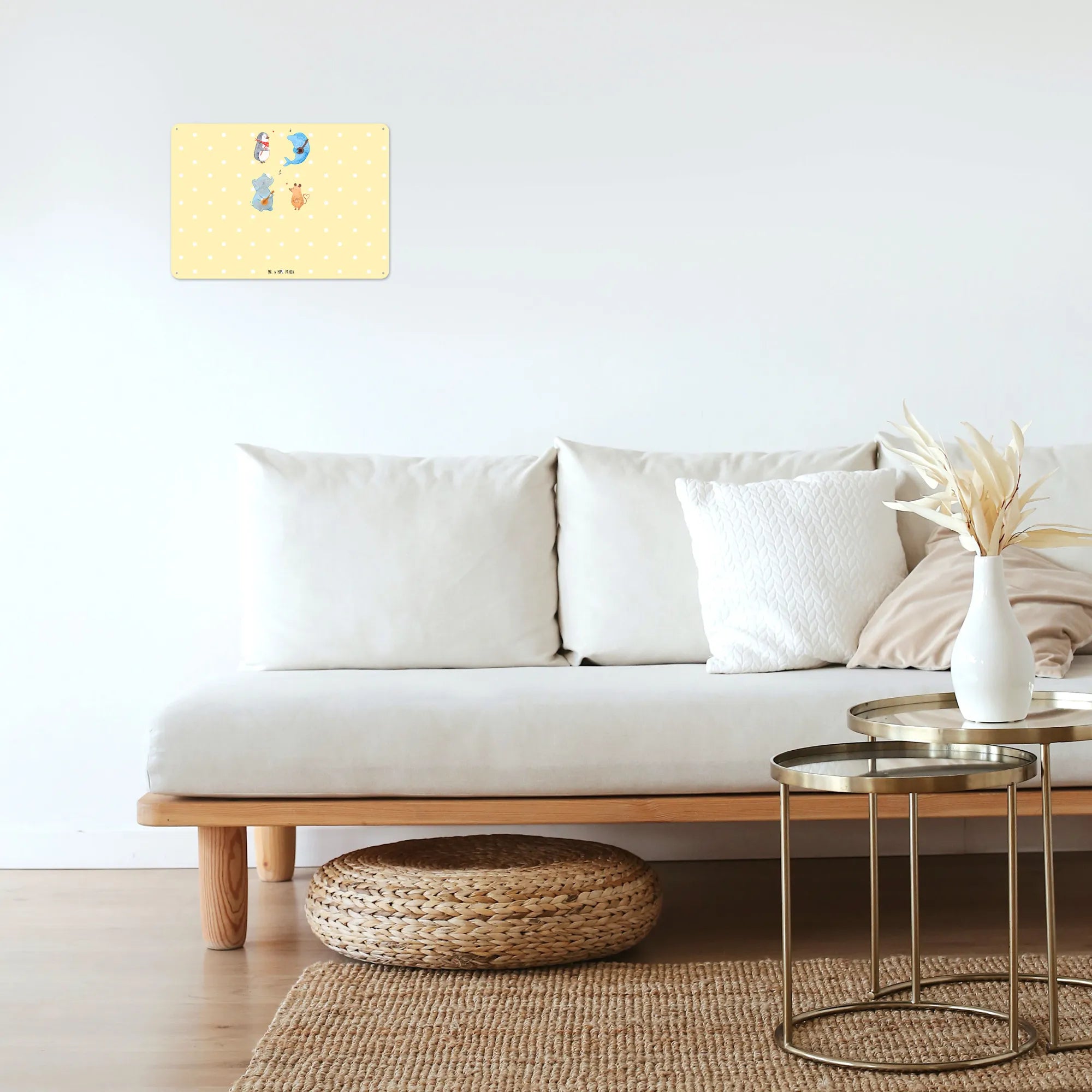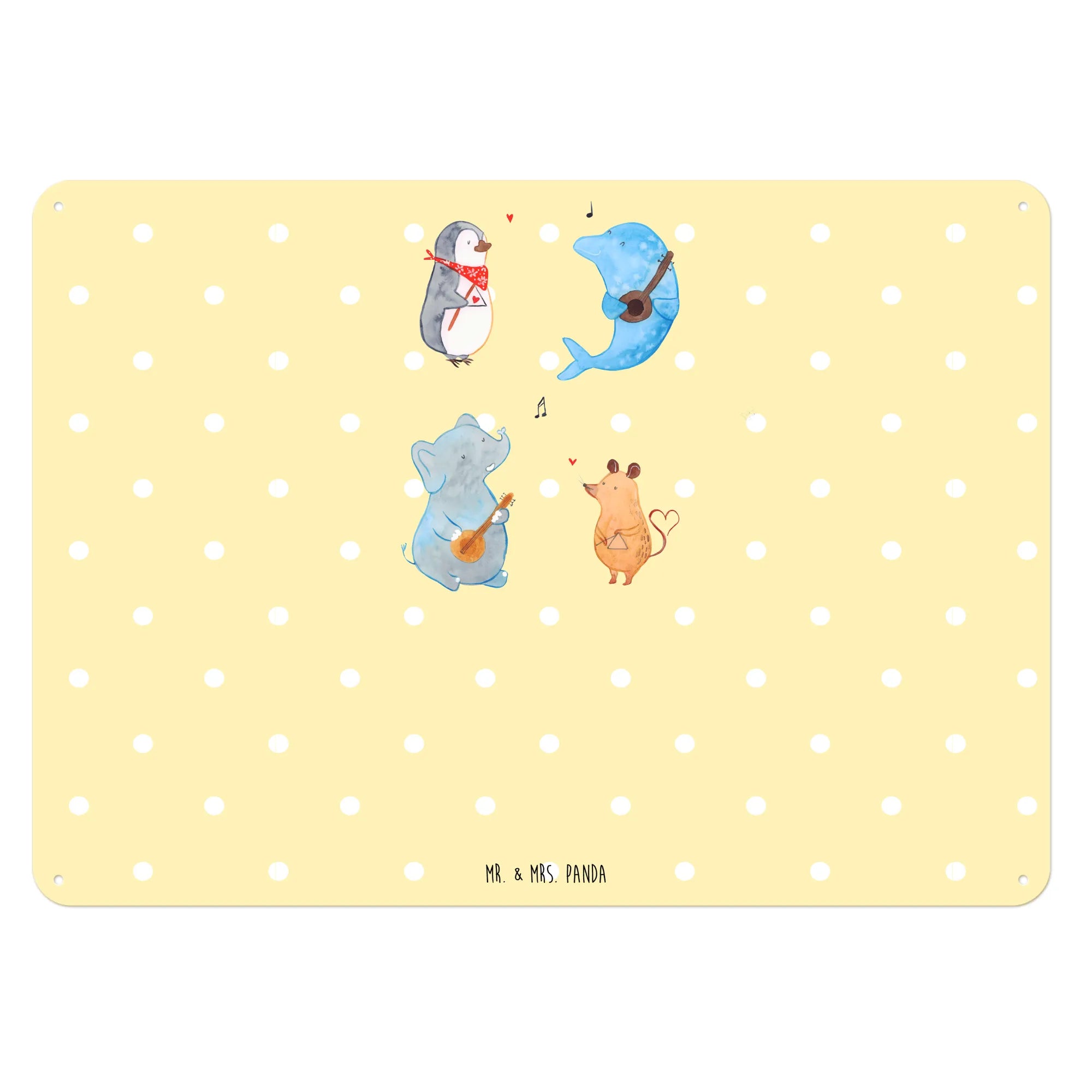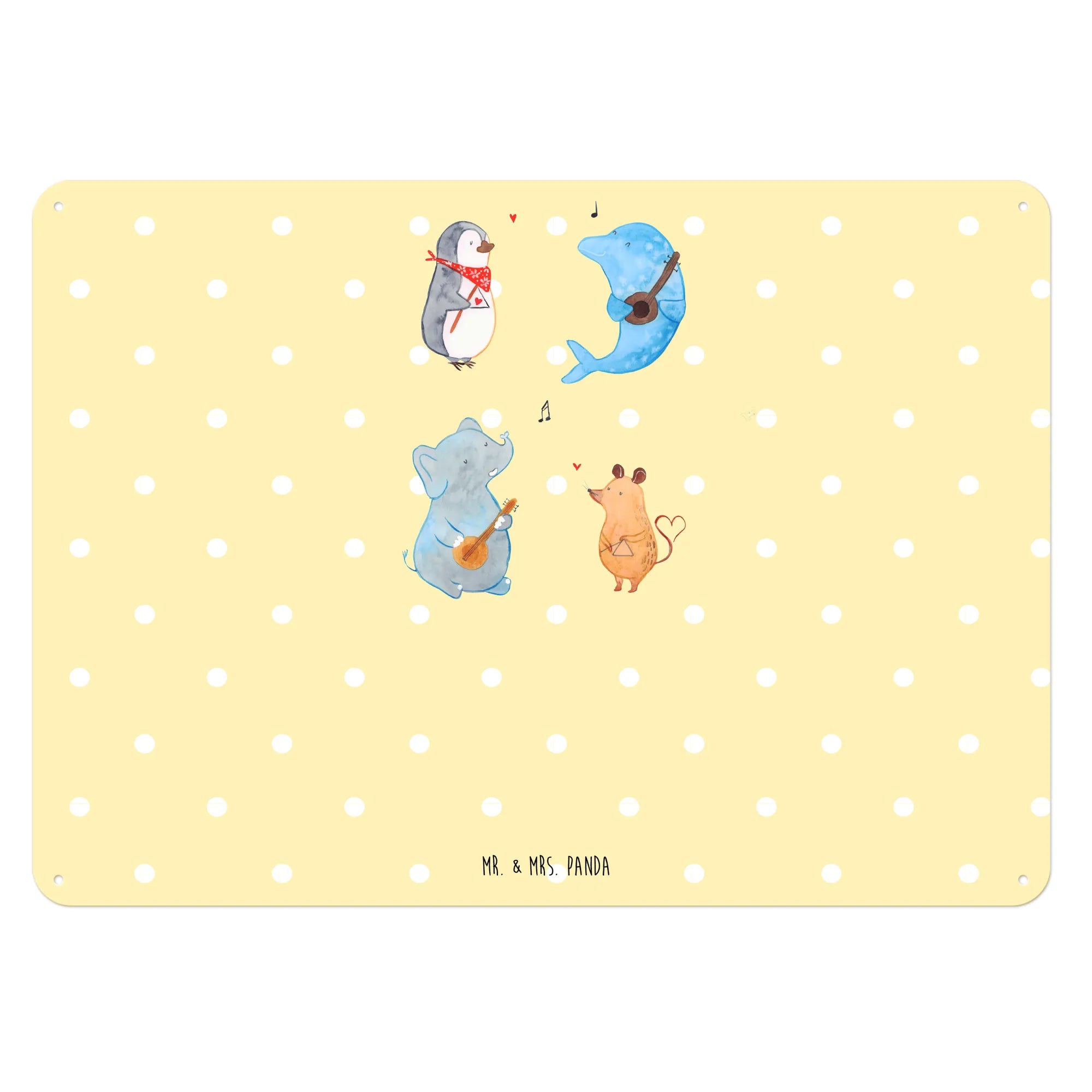 Das Blechschild "Big Band" aus der Kollektion "Small World" von Mr. & Mrs. Panda bringt Musik und gute Laune in dein Zuhause. Mit einem charmanten Motiv, das einen Pinguin, eine Maus, einen Delfin und einen Elefanten zeigt, die zusammen Musik machen, wirst du beim Anblick dieses Schildes sofort in Festlaune versetzt!