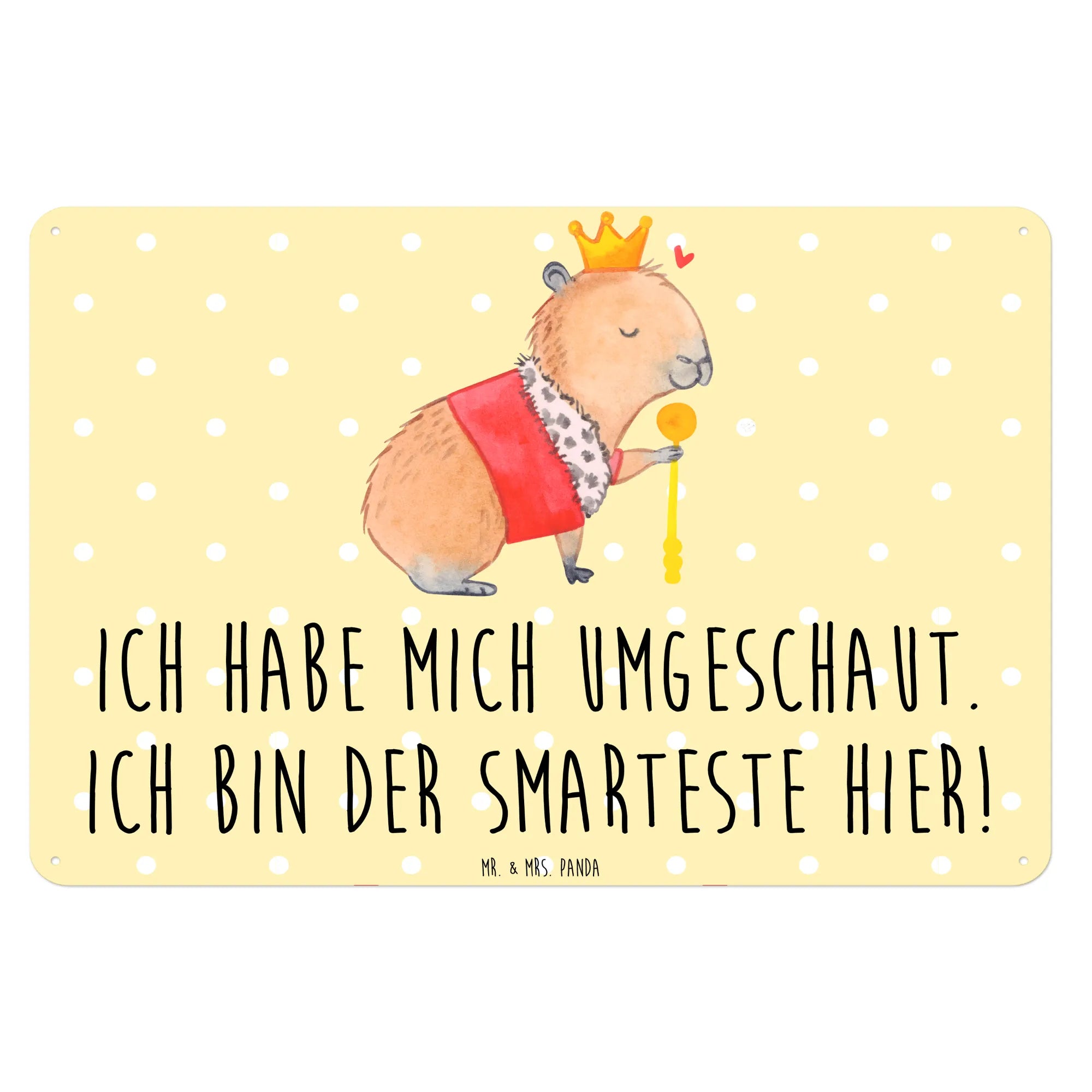 Das handgezeichnete Motiv zeigt ein majestätisches Capybara, das mit einer goldenen Krone und einem purpurroten Mantel ausgestattet ist. Die liebevollen Details, wie das kleine Herzchen über dem Kopf des Capybaras, verleihen diesem Schild eine besondere Note. Der Spruch "Ich habe mich umgeschaut. Ich bin der Smarteste hier!" bringt jeden zum Schmunzeln und ist perfekt für Jung und Alt.