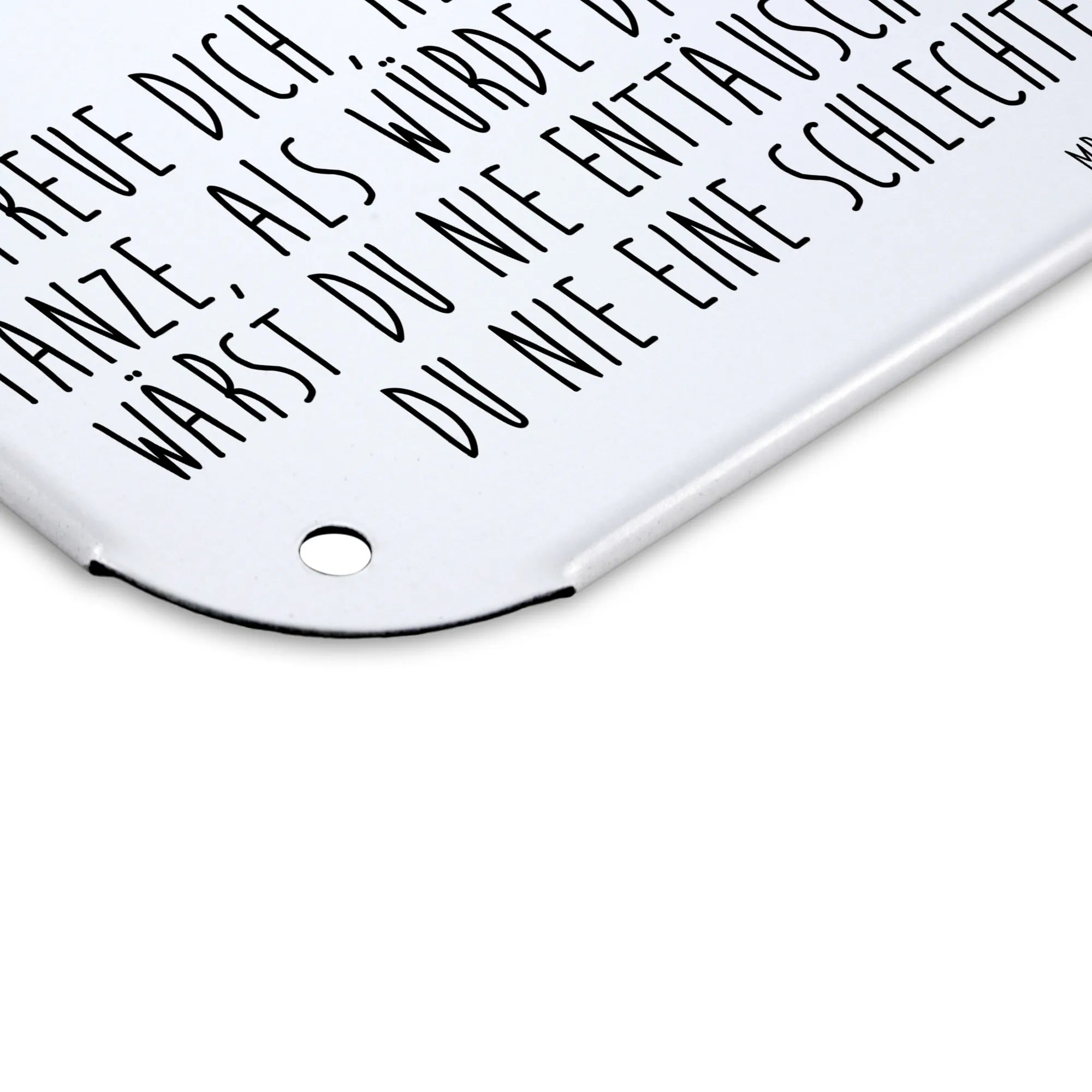 Hergestellt aus edlem Stahlblech, ist das Schild nicht nur ein echter Hingucker, sondern auch äußerst langlebig. Die seidenmatte Oberfläche unterstreicht die liebevoll gestalteten Motive und Sprüche, die darauf abgebildet sind. Der inspirierende Text „Freue dich, als wäre jeder Moment ein Geschenk. Tanze, als würde dich niemand beobachten. Liebe, als wärst du nie enttäuscht worden. Hoffe, als hättest du nie eine schlechte Erfahrung gemacht.“ sorgt für eine positive Stimmung und motiviert dazu, das Leben in vollen Zügen zu genießen.