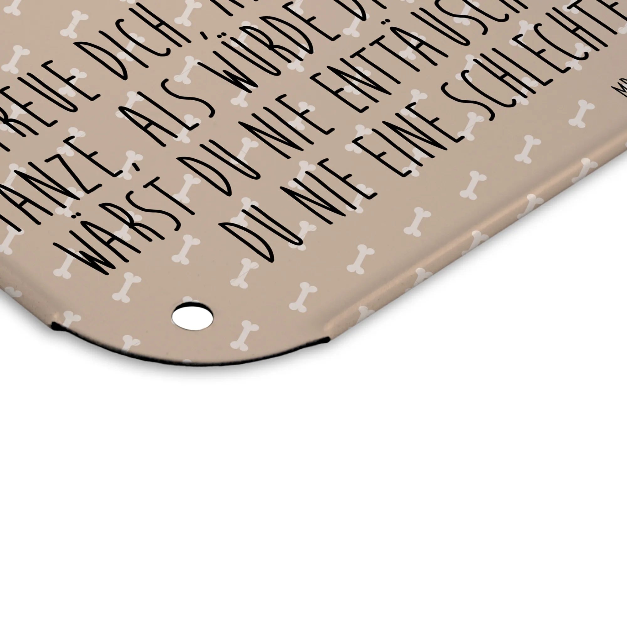 Das hochwertige Blechschild hat eine seidenmatte Oberfläche und ist aus edlem Stahlblech gefertigt. Mit 4 Bohrungen zur einfachen Befestigung kann es sowohl als Wanddeko als auch als Türschild verwendet werden. Für Hundebesitzer ist dieses dekorative Element nicht nur ein Blickfang, sondern auch ein ständiger Begleiter, der positive Gedanken in den Alltag bringt. Ob in der Küche, im Wohnzimmer oder im Hundebereich, es verleiht jedem Raum eine besondere Note.
