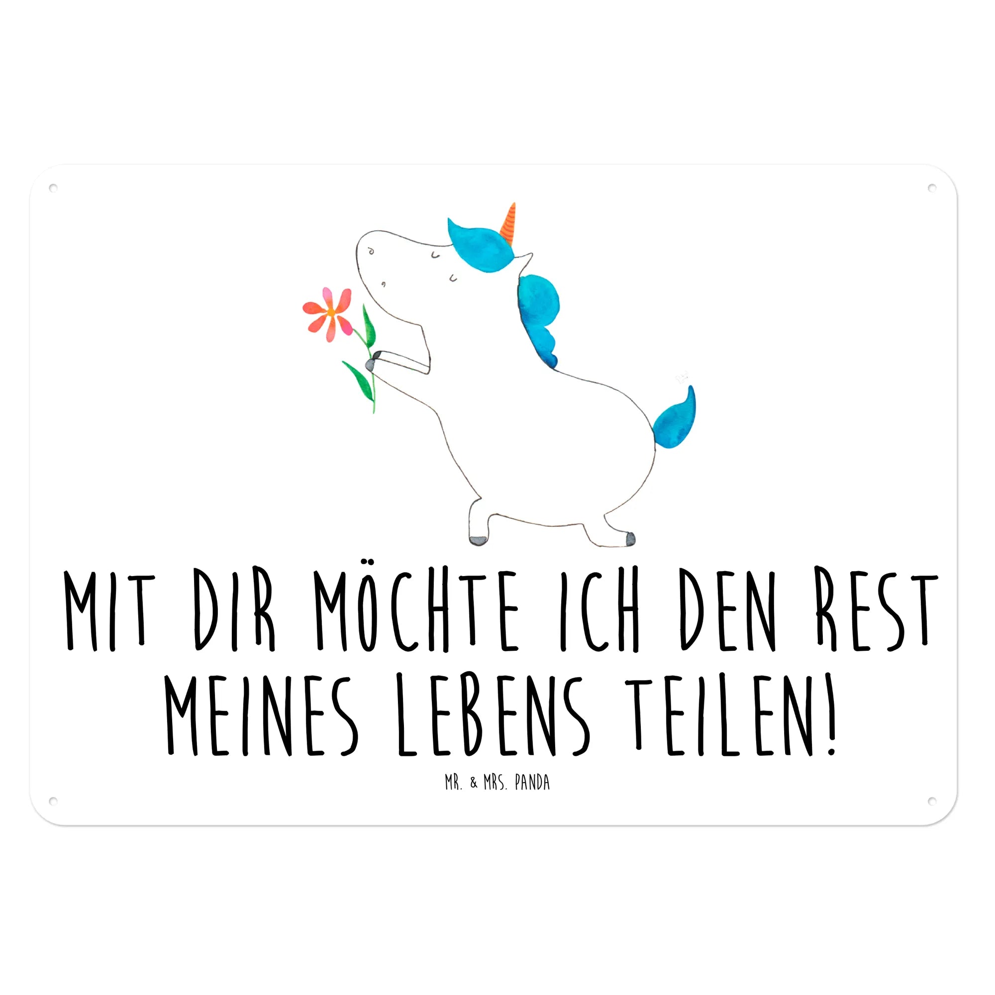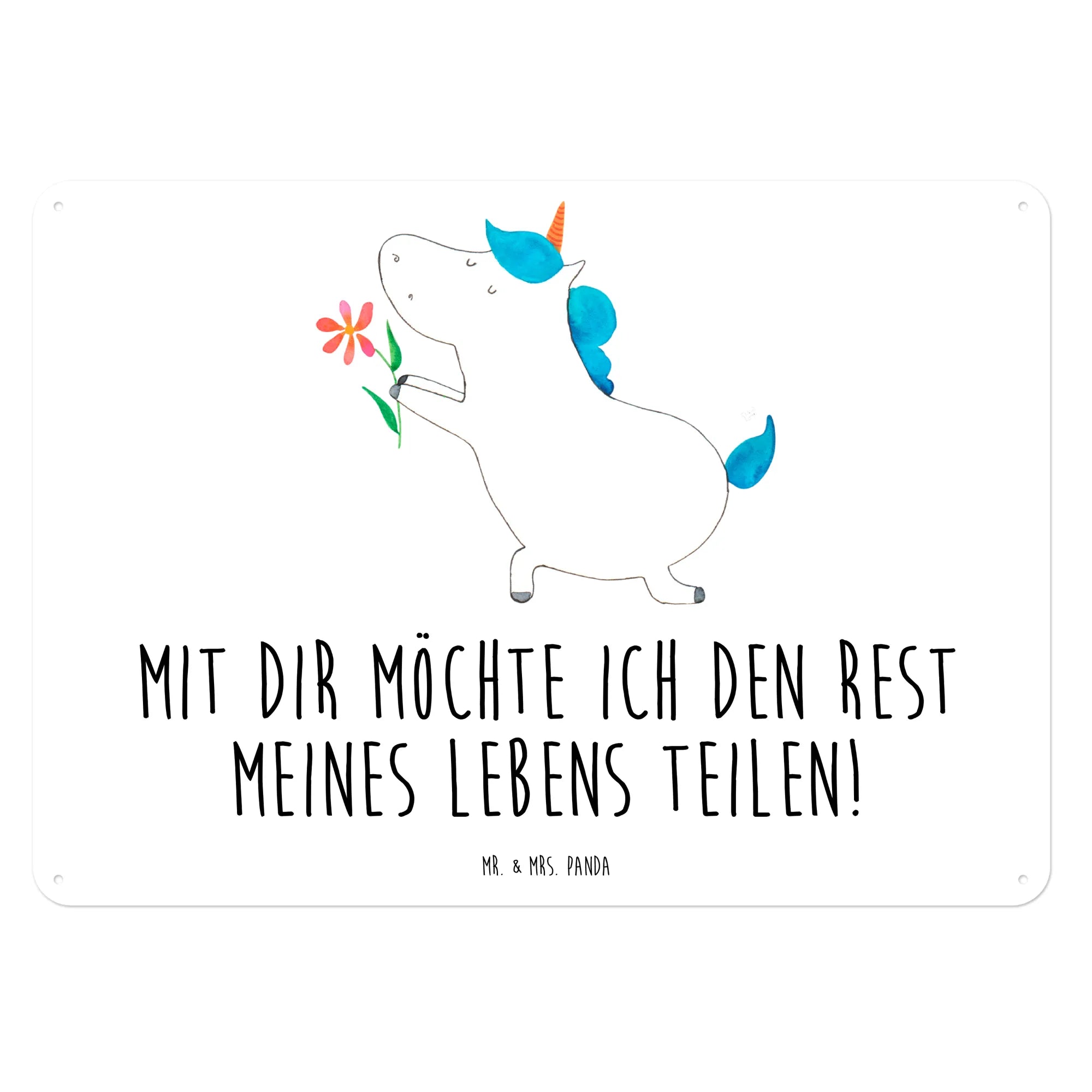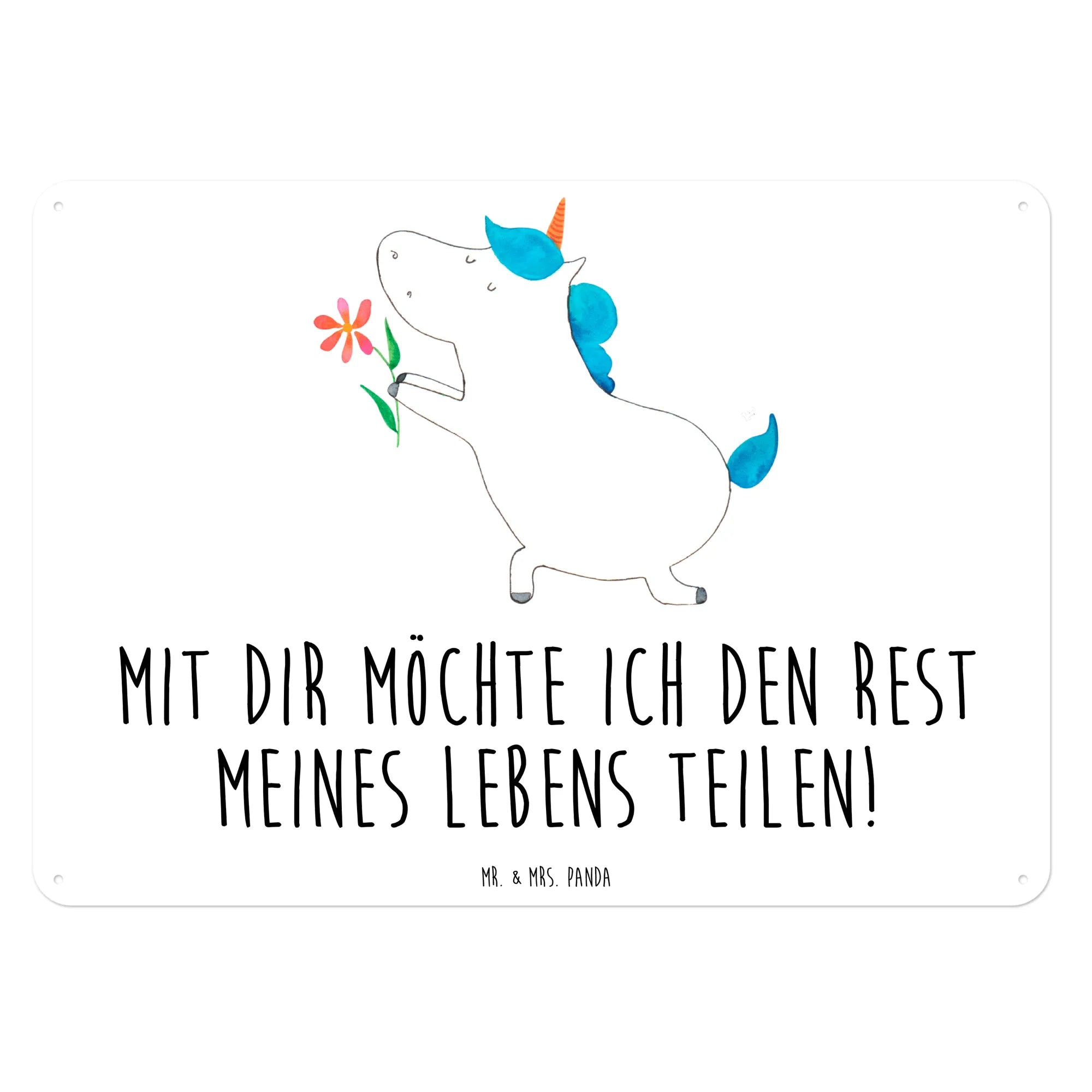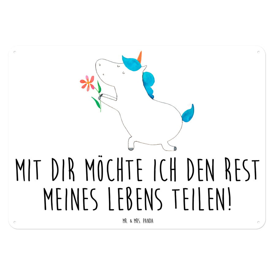 Das wunderschöne und edle Blechschild von Mr. & Mrs. Panda mit dem zauberhaften Motiv "Einhorn Blume" ist das perfekte Geschenk für alle, die an die Magie der Einhörner glauben! Dieses Schild ist nicht nur ein echter Hingucker, sondern vermittelt auch eine Botschaft voller Liebe: "Mit dir möchte ich den Rest meines Lebens teilen!"