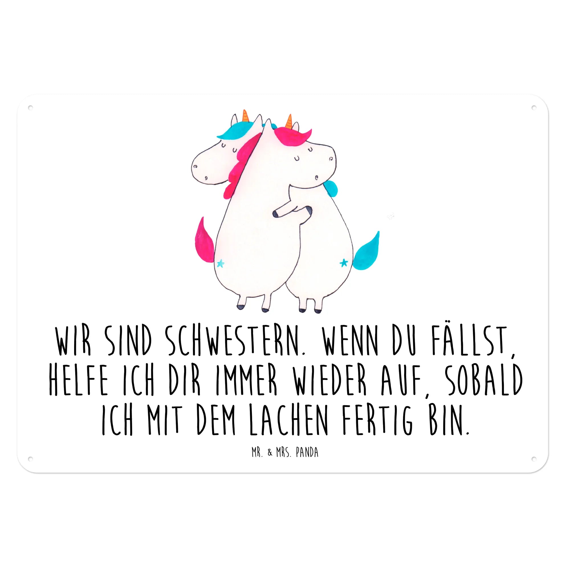Das wunderschöne und edle Blechschild "Einhörner Umarmen" von Mr. & Mrs. Panda ist das ideale Geschenk für deine Lieblingsschwester oder beste Freundin! Mit den niedlichen, umarmenden Einhörnern und dem witzigen Spruch: "Wir sind Schwestern. Wenn du fällst, helfe ich dir immer wieder auf, sobald ich mit dem Lachen fertig bin", sorgt dieses Schild garantiert für ein Lächeln im Gesicht der Beschenkten. Ob zum Geburtstag, zu Feiertagen oder einfach mal zwischendurch – dieses Schild ist ein herzliches Kompliment an die Geschwisterliebe.