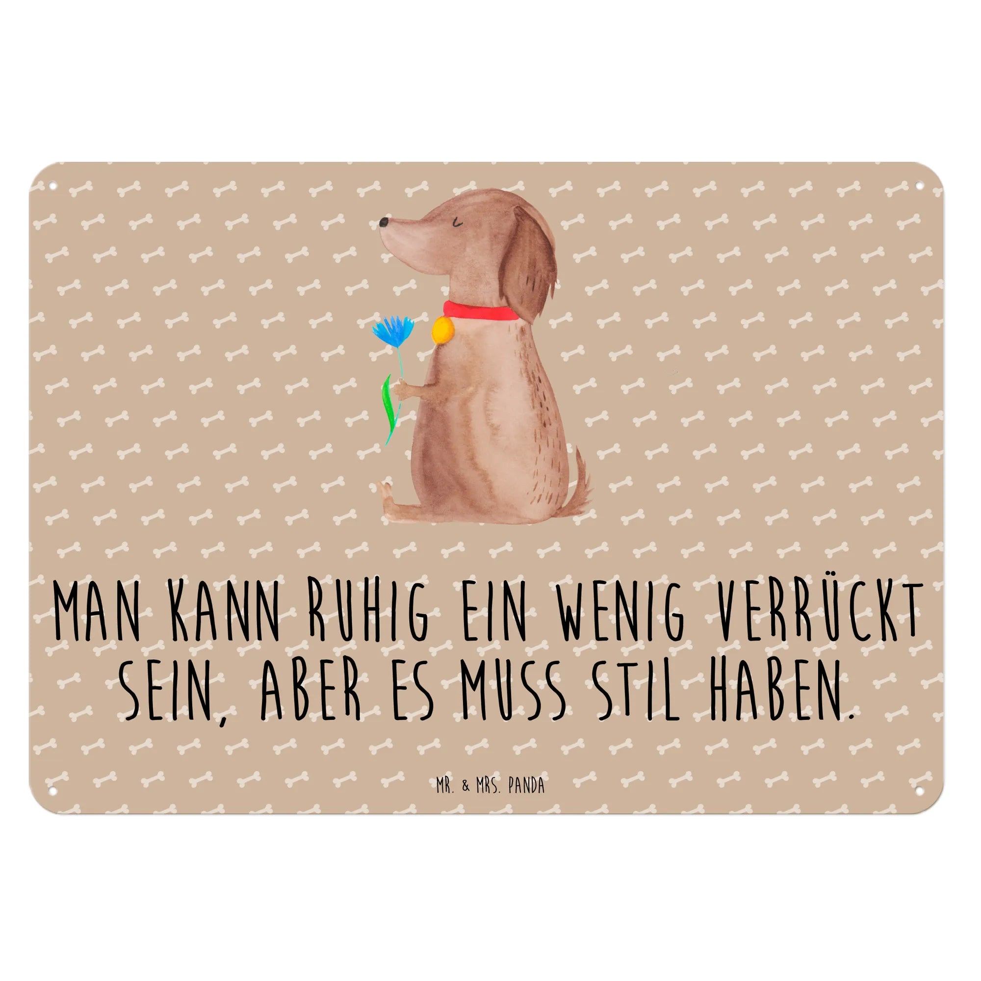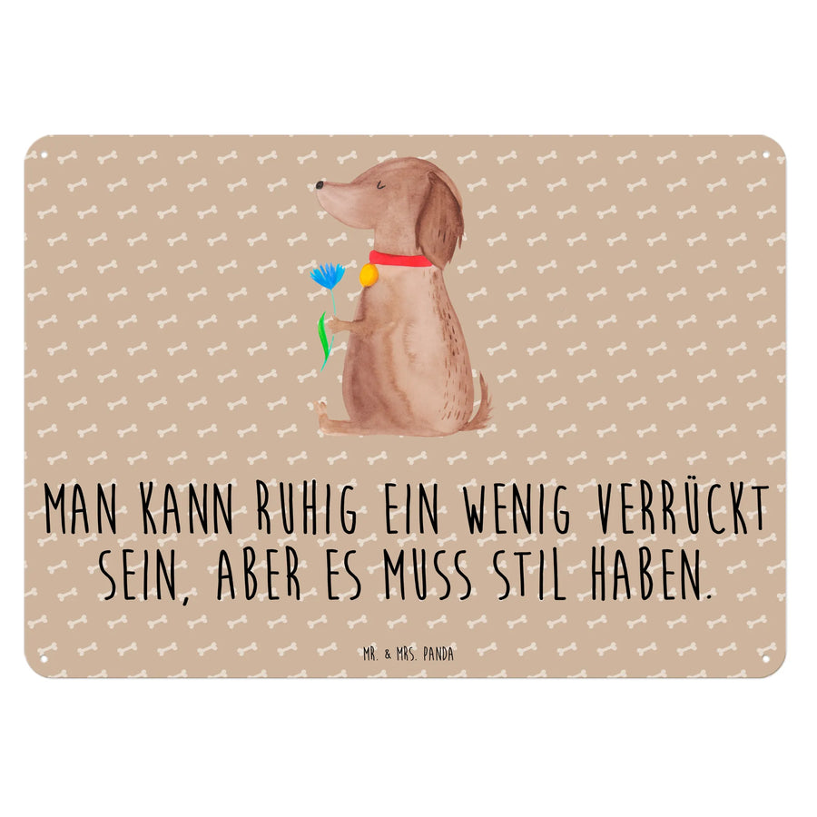 Entdecke das wunderschöne Metallschild "Hund Blume" von Mr. & Mrs. Panda! Dieses edle Blechschild ist die perfekte Dekoration für jeden Hundeliebhaber. Das Motiv zeigt eine süße Hündin mit einer Blume im Fell und trägt den Spruch: "Man kann ruhig ein wenig verrückt sein, aber es muss Stil haben." Mit seinen liebevollen Details und der ästhetischen seidenmatten Oberfläche wird dieses Schild zum Blickfang in jedem Zuhause.