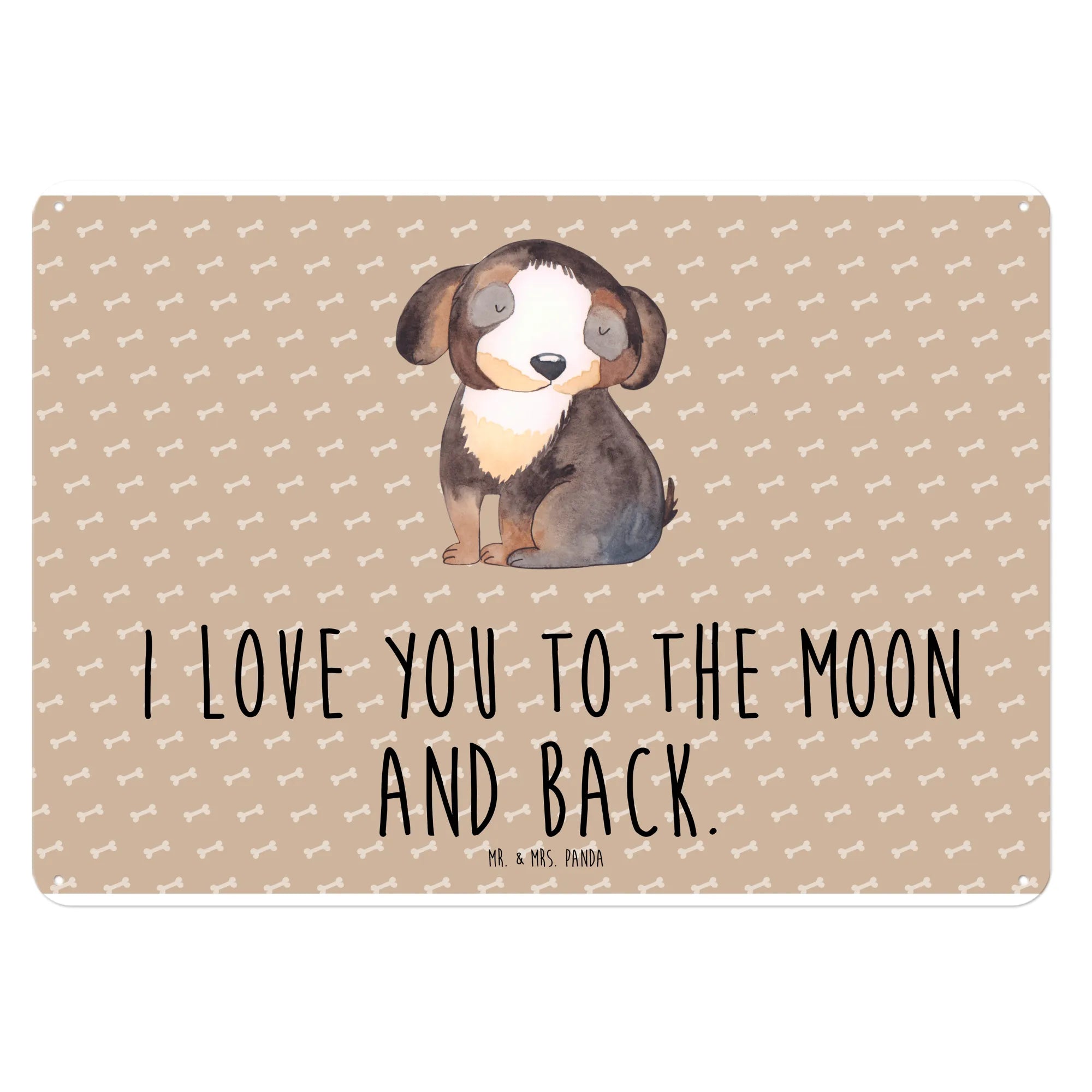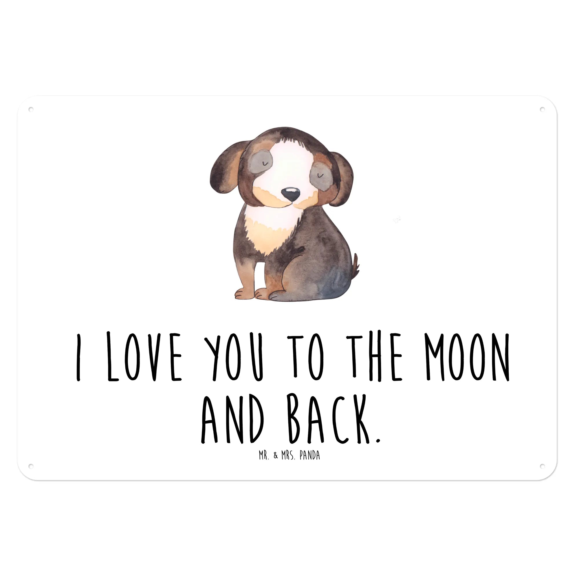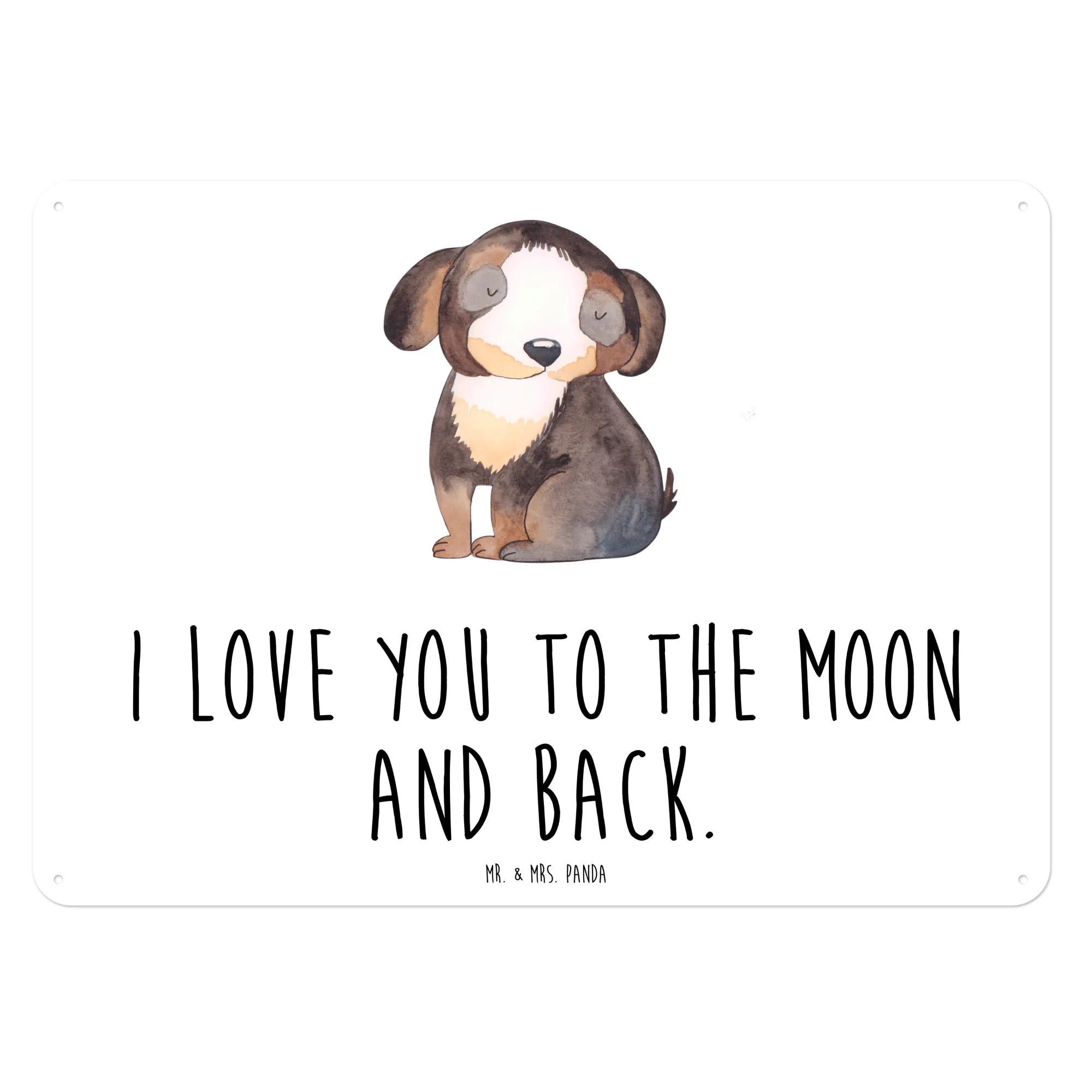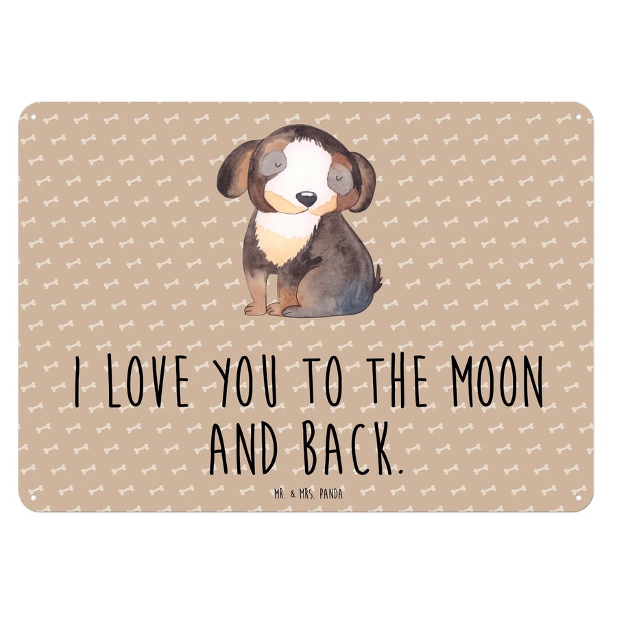 Ein wunderschönes und edles Blechschild von Mr. & Mrs. Panda, das mit einem süßen, schwarz-weißen Hundemotiv begeistert. Das Schild zeigt einen entspannten Hund und trägt den liebevollen Slogan 'I love you to the moon and back.' Es ist perfekt für alle Hundeliebhaber und Hundebesitzer, die ihre Leidenschaft für Hunde Ausdruck verleihen möchten.