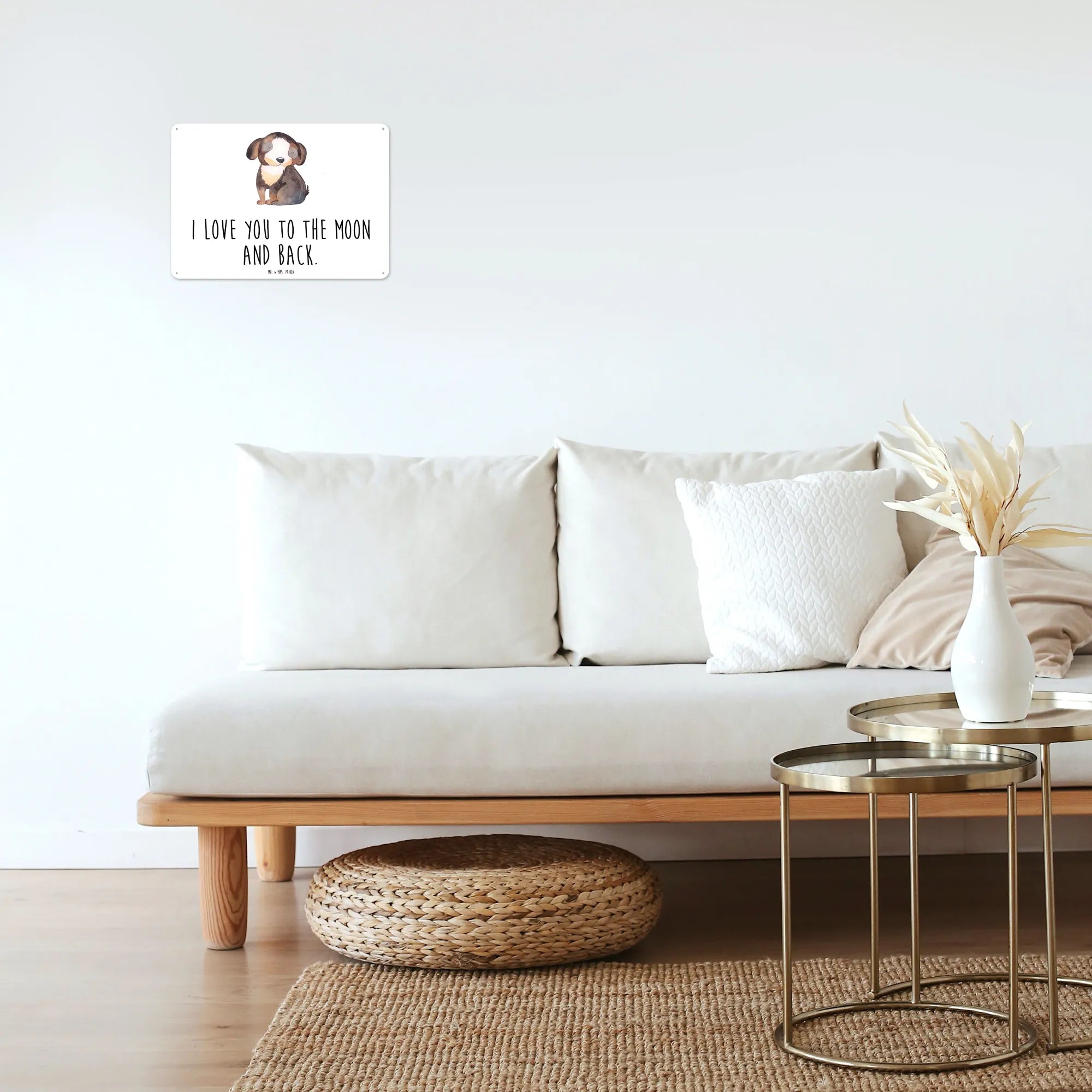 Das wunderschöne Blechschild "Hund entspannt" aus der Hunde Kollektion von Mr. & Mrs. Panda ist das perfekte Geschenk für jeden Hundeliebhaber. Der edeldruckte Slogan "I love you to the moon and back" und das charmante Motiv eines entspannten schwarz-weißen Hundes fügen jedem Raum eine liebevolle Note hinzu. Ob du es dir selbst gönnen oder jemanden anderen glücklich machen möchtest, dieses Schild ist eine wunderbare Wahl.