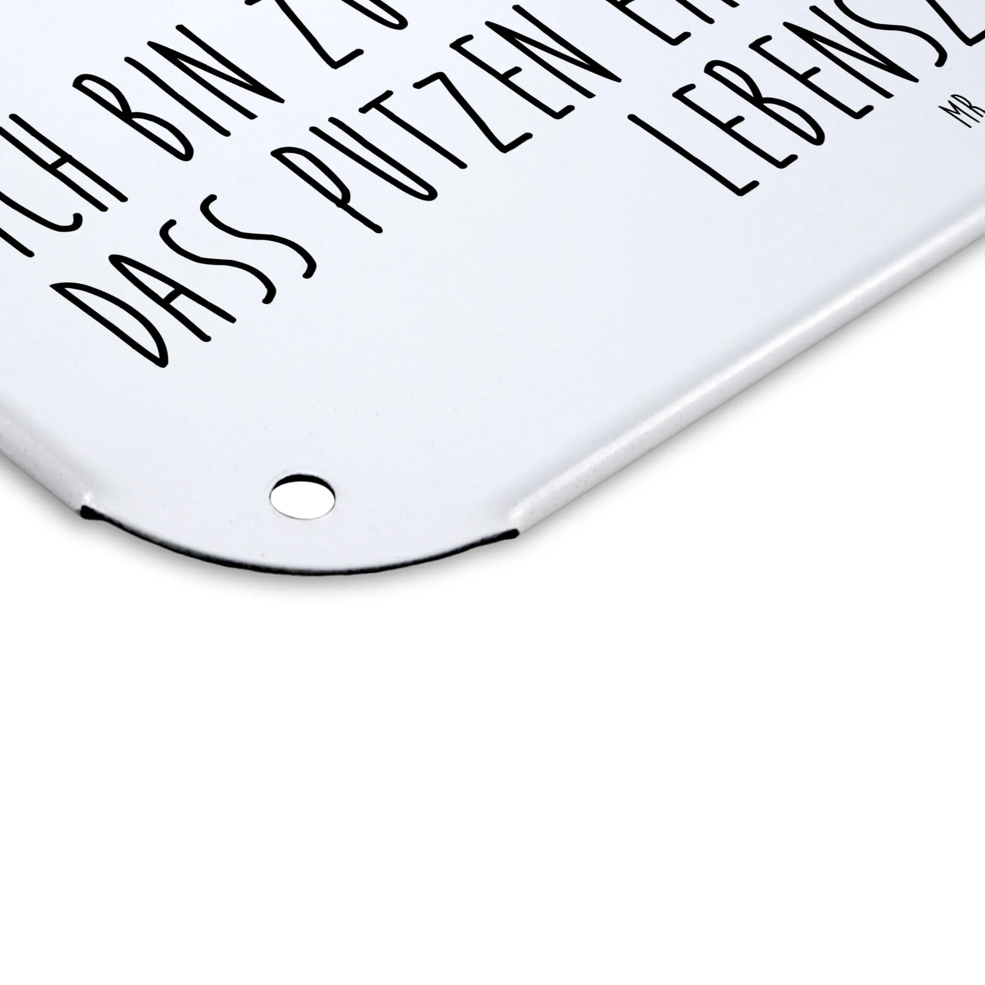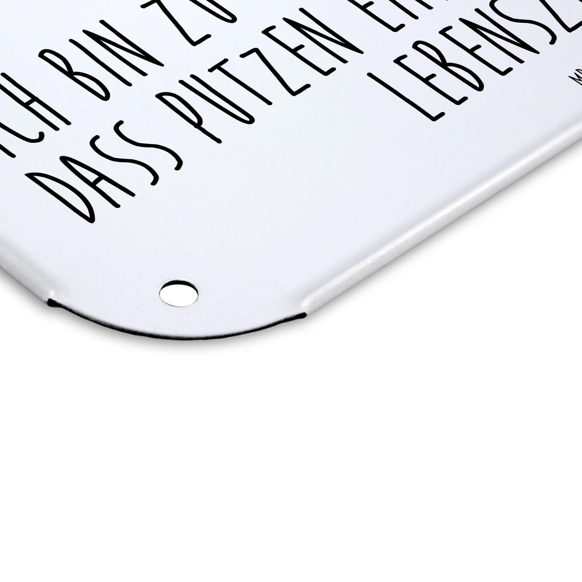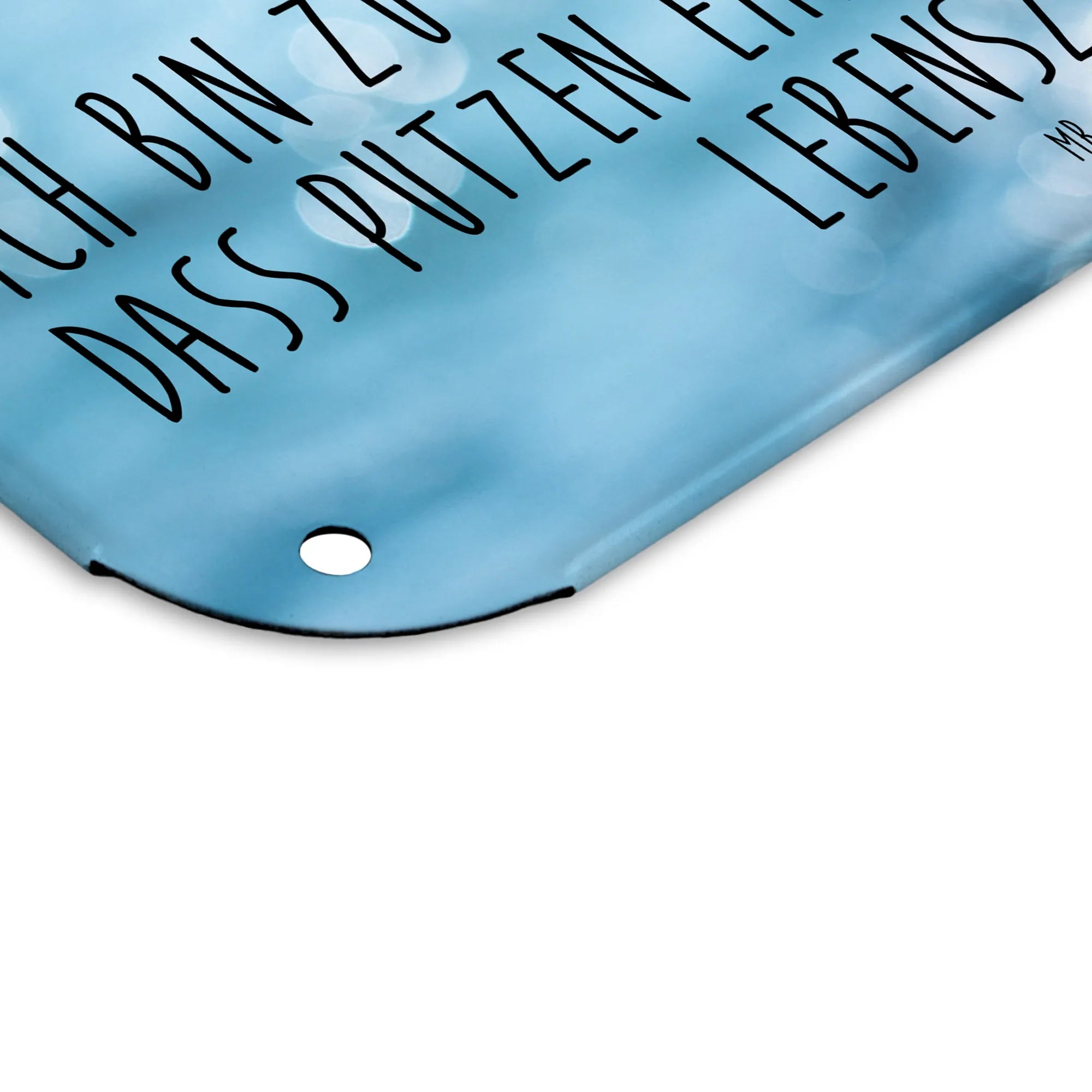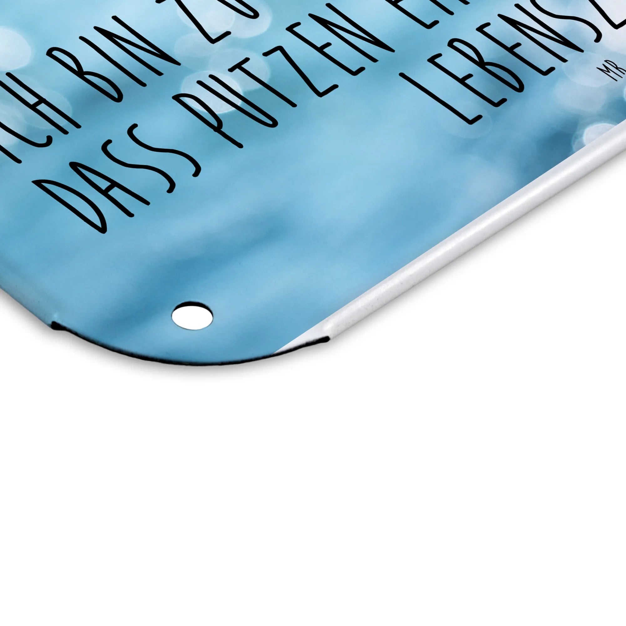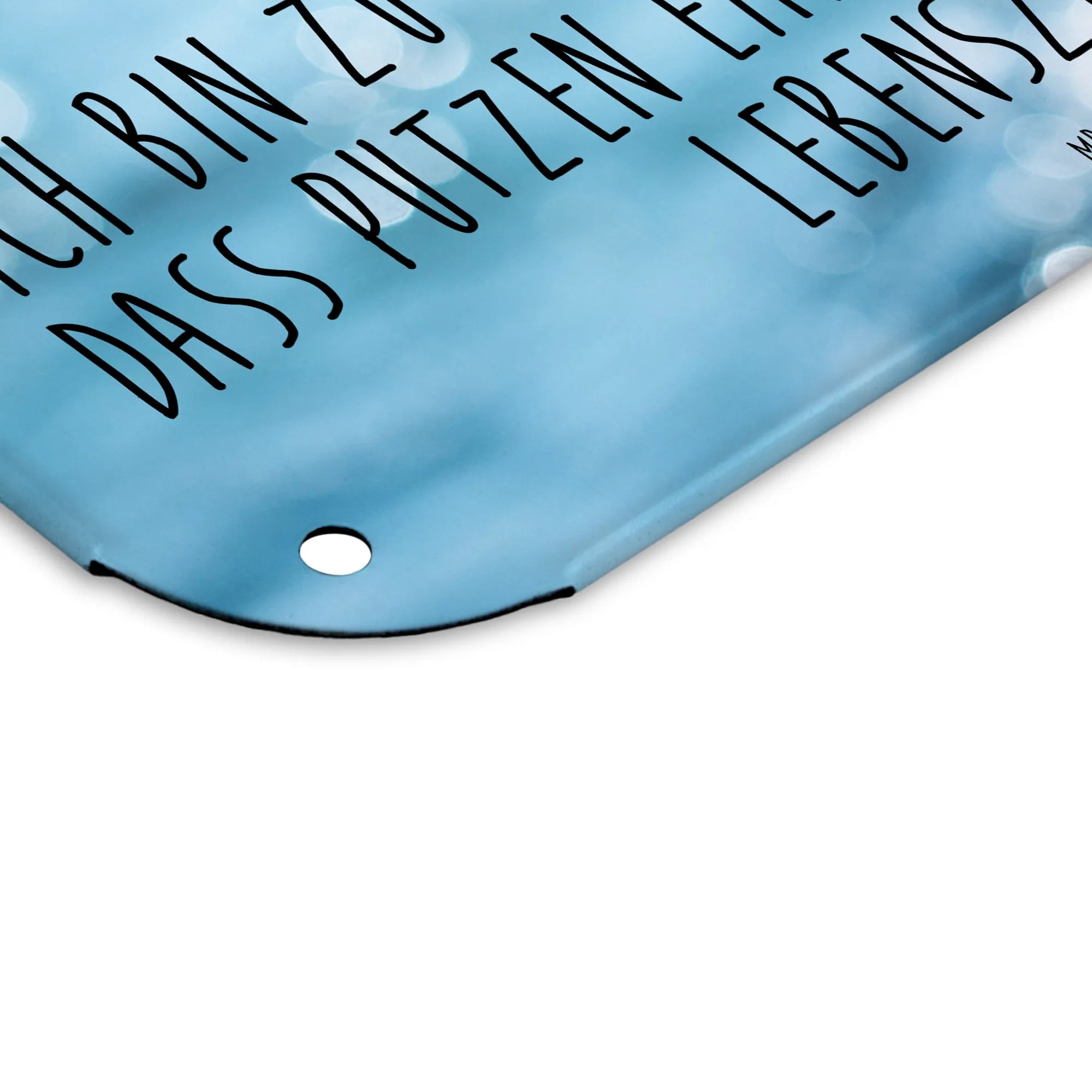 Das Schild misst DIN A5 und ist aus hochwertigem Stahlblech gefertigt, das langlebig und farbecht bedruckt ist. Mit abgerundeten Ecken und umgefalzten Kanten wird die Sicherheit und Qualität des Produkts gewährleistet. Es ist ideal für die Wand oder die Tür und verschönert jedes Kinderzimmer, das Badezimmer oder sogar den Flur. Der charmante Spruch: „Ich bin zu der Erkenntnis gekommen, dass Putzen eine Verschwendung von Lebenszeit ist.“ lädt zum Schmunzeln ein und spricht sicherlich die Hausfrau oder den Hausmann an, die im Alltag oft mit dem Putzen beschäftigt sind.