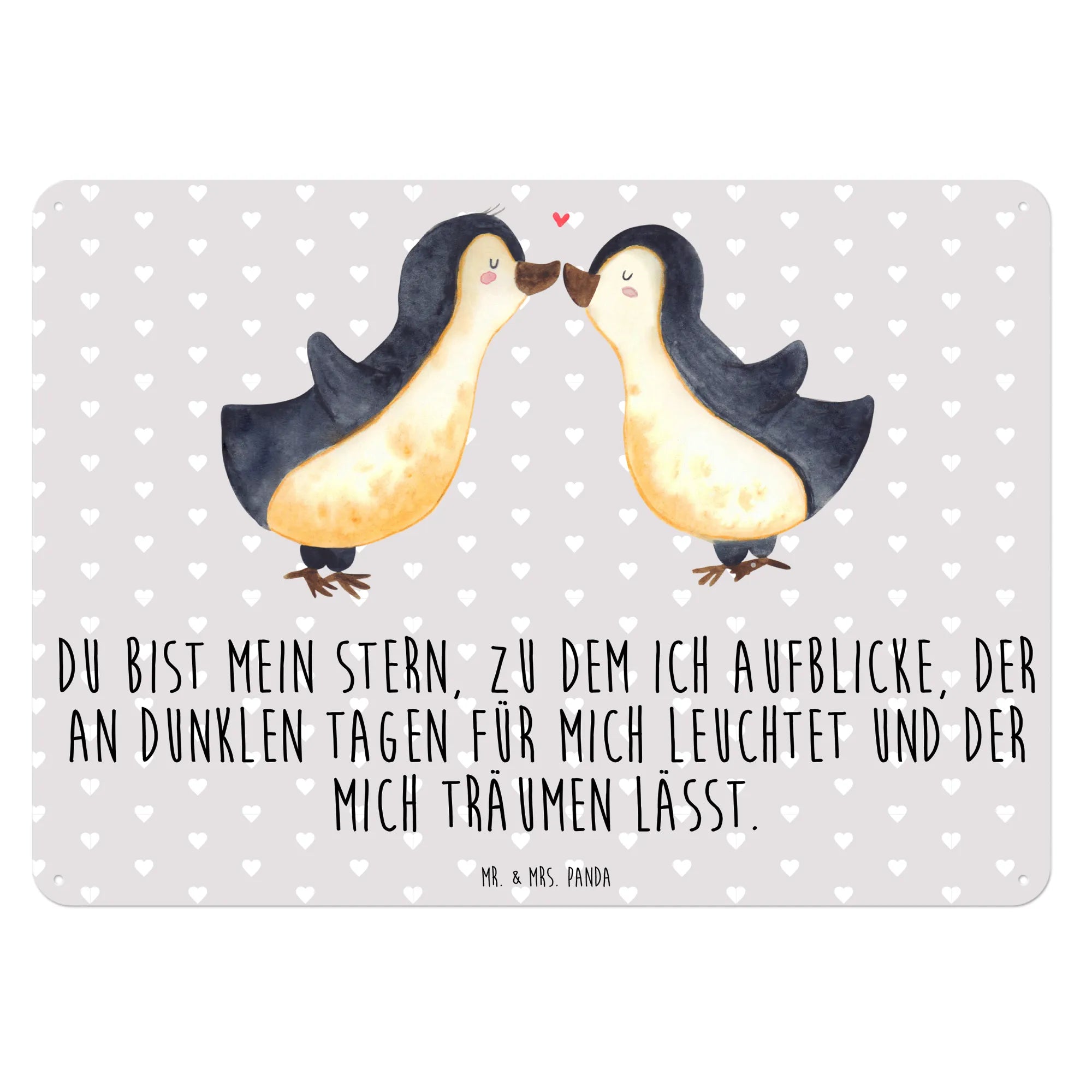 Das wunderschöne Blechschild "Pinguin Liebe" von Mr. & Mrs. Panda ist das perfekte Geschenk für Verliebte! Mit einem bezaubernden Motiv von zwei kuschelnden Pinguinen, die sich zärtlich an den Schnäbeln berühren und einem schwebenden Herz, symbolisiert dieses Schild die unvergängliche Liebe. Der Slogan "Du bist mein Stern, zu dem ich aufblicke, der an dunklen Tagen für mich leuchtet und der mich träumen lässt" verstärkt die emotionale Botschaft.