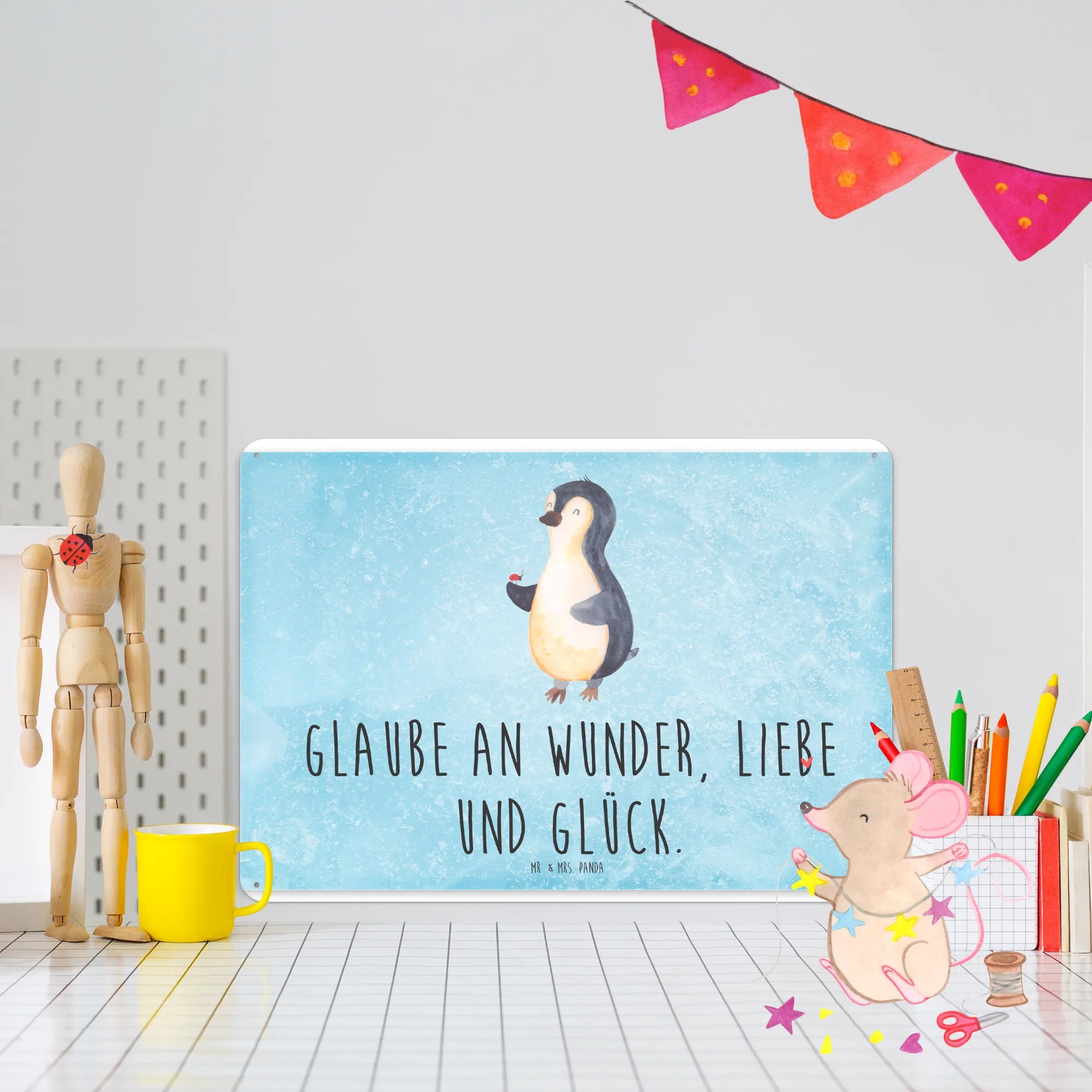 Hol dir gute Laune an die Wand: Das Blechschild „Pinguin Marienkäfer" aus der Pinguin - Kollektion von Mr. & Mrs. Panda ist ein kleiner Glücksbringer für dein Zuhause. Der niedliche Pinguin mit dem fröhlichen Marienkäfer auf der Flosse und der liebevolle Spruch „Glaube an Wunder, Liebe und Glück." zaubern ein warmes Gefühl in Flur, Wohnzimmer oder Kinderzimmer.