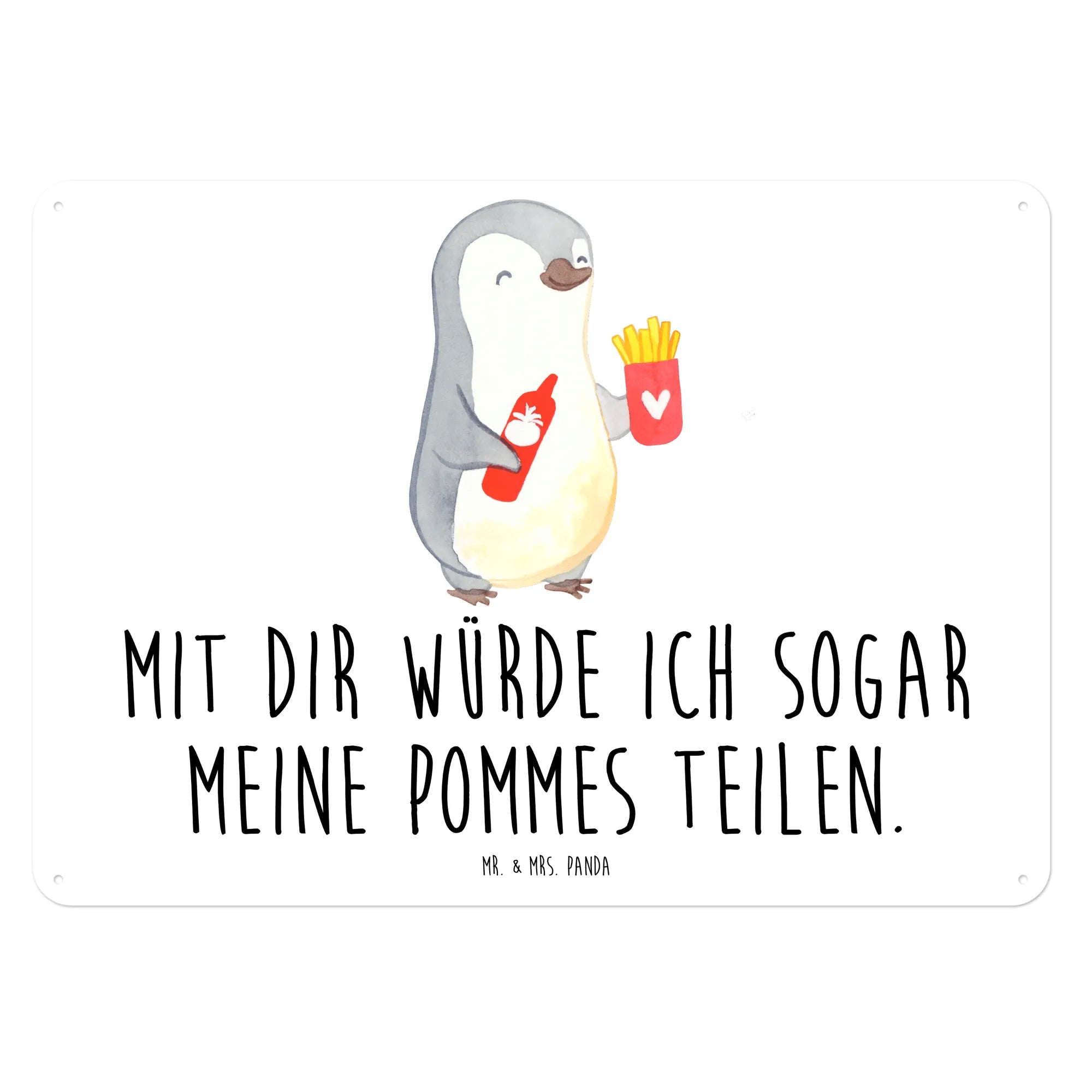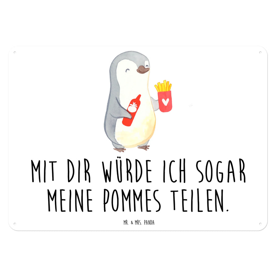 Ein wunderschönes und edles Blechschild von Mr. & Mrs. Panda, perfekt für alle, die ihren Lieblingsmenschen eine Freude machen möchten! Das Motiv mit dem glücklichen Pinguin, der mit seinen Pommes Frites und einer Flasche Ketchup einen liebevollen Ausdruck eurer Zuneigung vermittelt, ist einfach bezaubernd. Mit dem Spruch: 'Mit dir würde ich sogar meine Pommes teilen.' verwandelt dieses Schild jede Wand in ein Liebesbekenntnis.