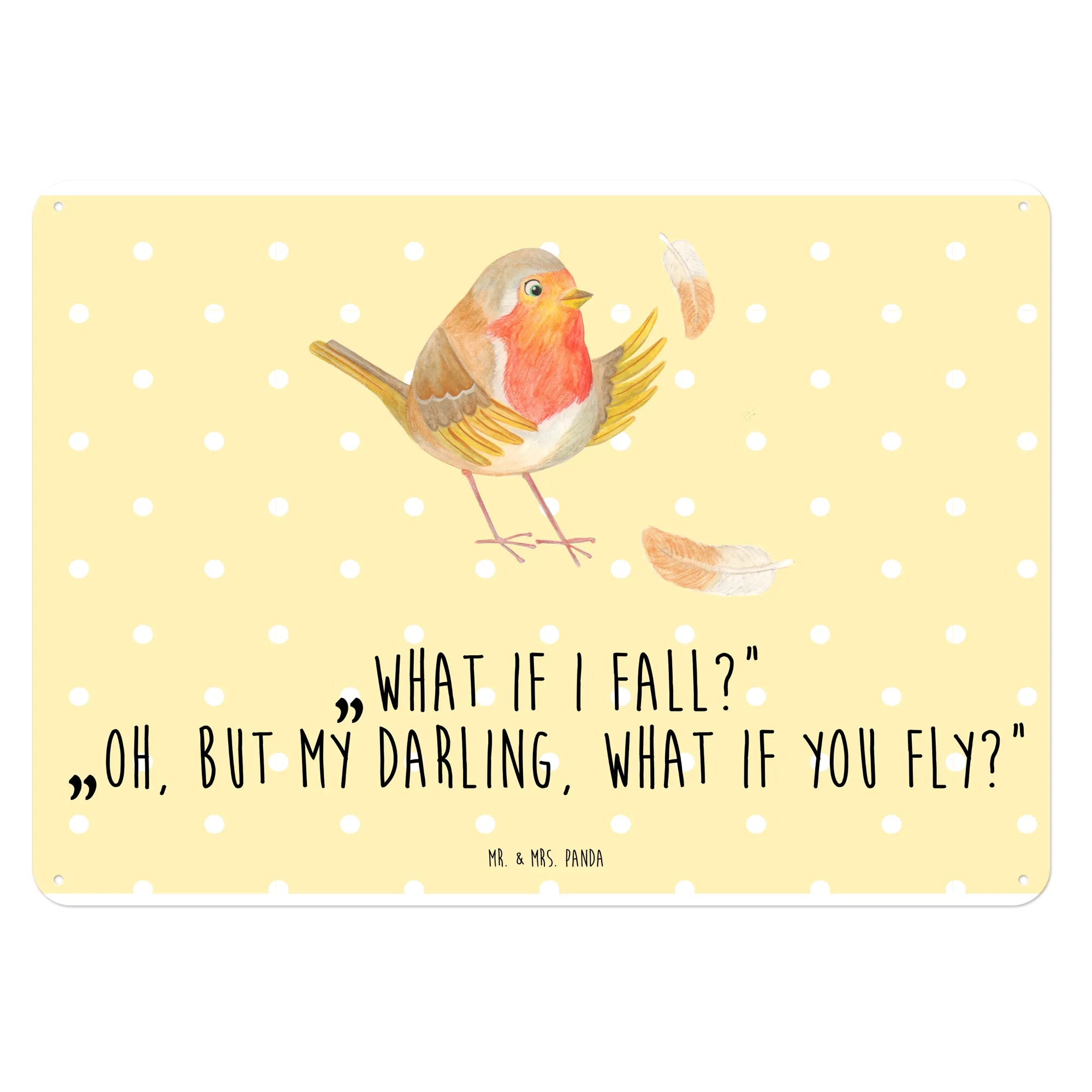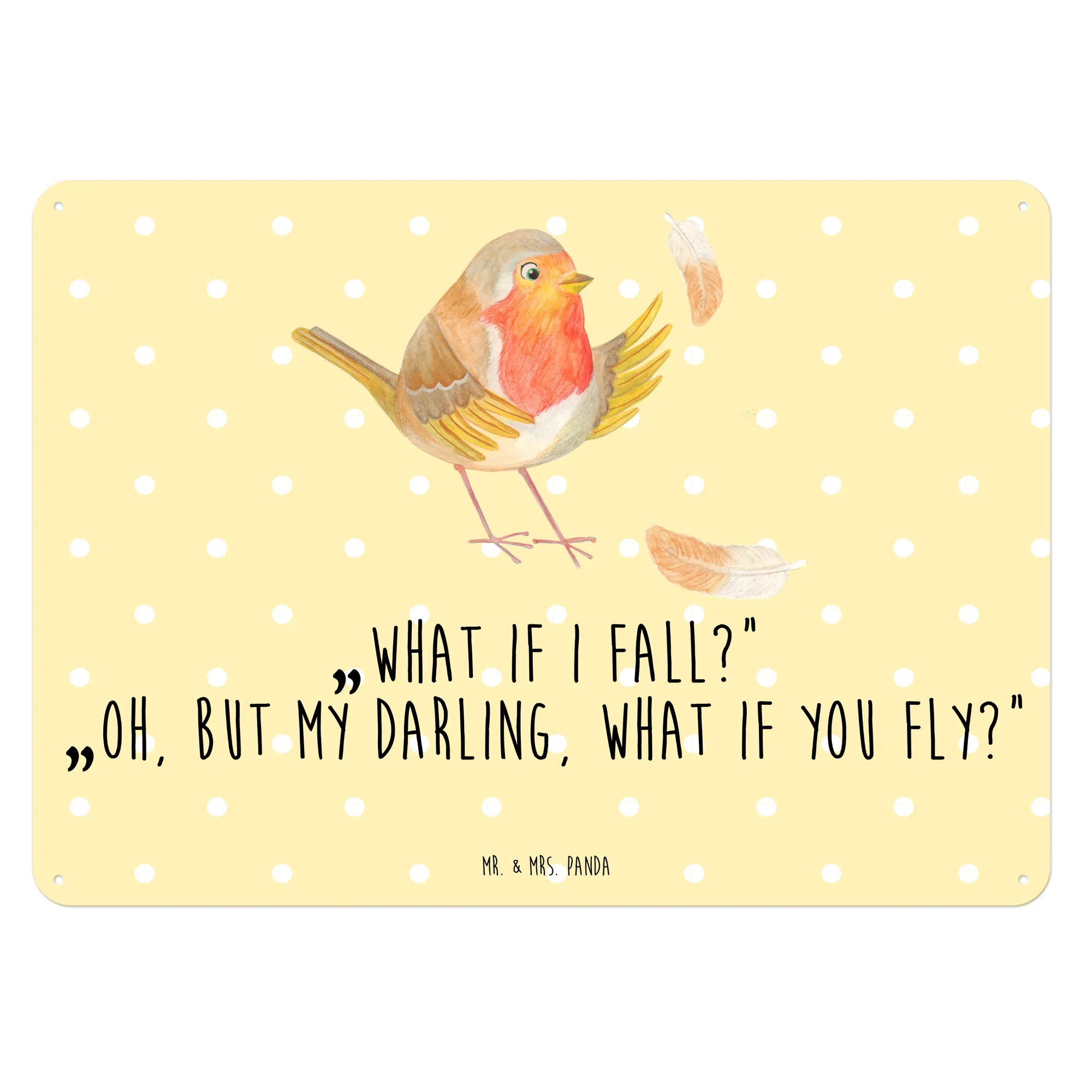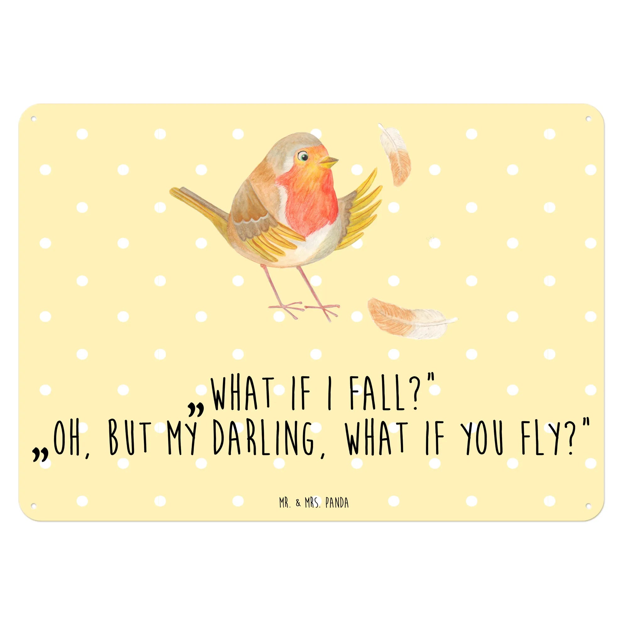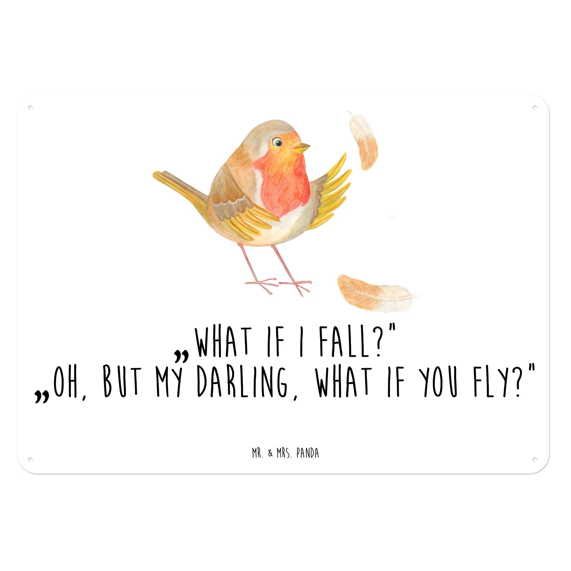 Das wunderschöne Blechschild "Rotkehlchen mit Federn" aus der Small World Kollektion von Mr. & Mrs. Panda ist ein wahrhaft zauberhaftes Geschenk für alle, die die Natur und ihre kleinen Wunder lieben. Dieses Schild, gefertigt aus hochwertigem Stahlblech, besticht durch sein niedliches Motiv und den poetischen Spruch: „What if I fall? Oh, but my darling, what if you fly?"
