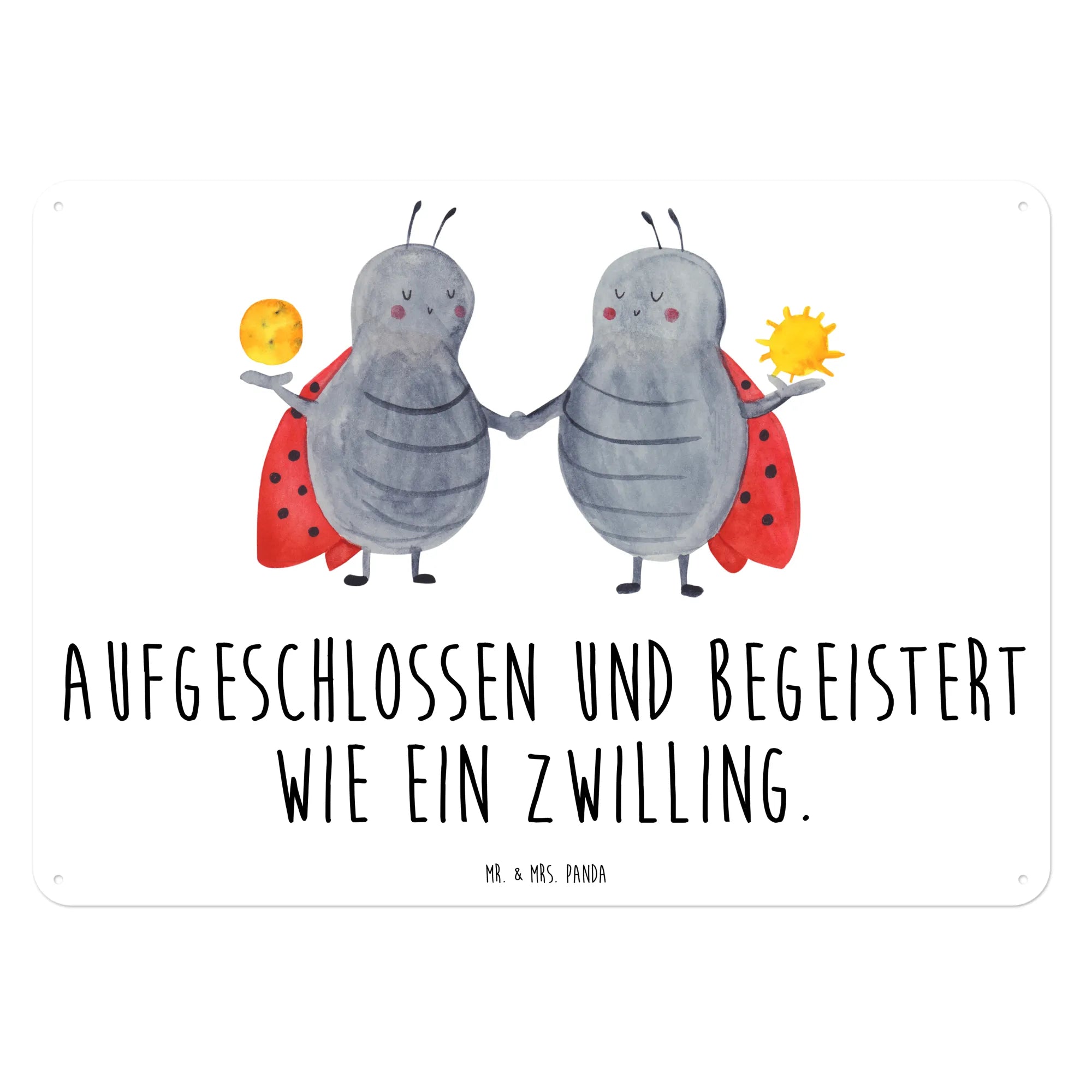 Mr. & Mrs. Panda Blechschild Sternzeichen Zwilling – bezaubernd, frech und voller Persönlichkeit. Unser Wandschild zeigt zwei süße Marienkäfer als Zwillinge und den liebevollen Spruch „Aufgeschlossen und begeistert wie ein Zwilling.“ Es ist das ideale Geschenk für alle, die im Mai oder Juni Geburtstag haben, für Zwillingsschwestern und Zwillingsbrüder oder einfach für Menschen, die den Zwilling im Herzen tragen.