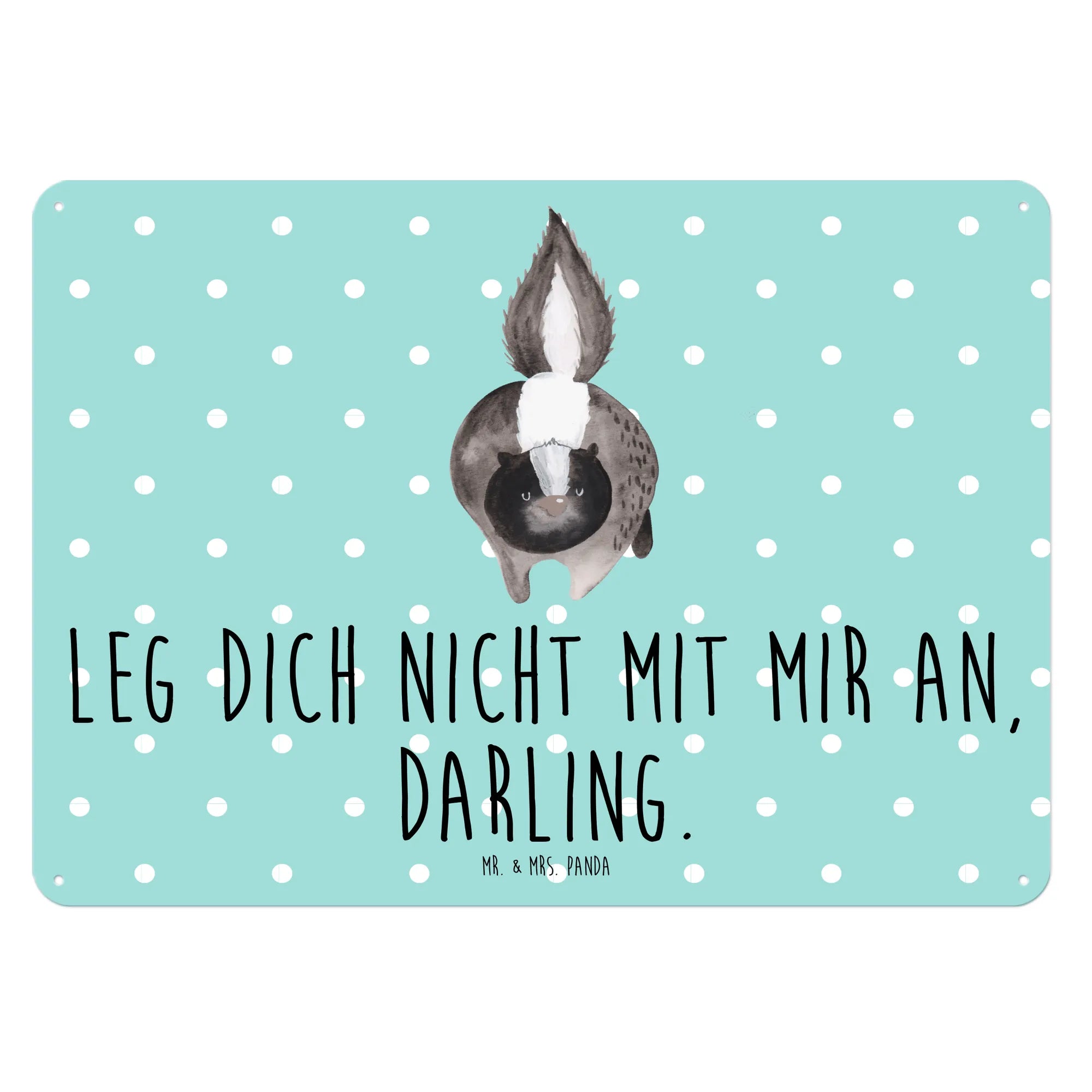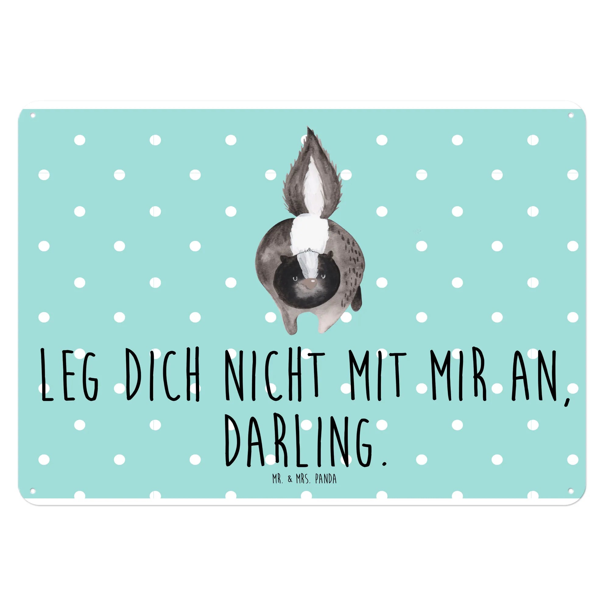 Ein wunderschönes und edles Blechschild von Mr. & Mrs. Panda, das ein süßes Stinktier in zeitloser Aquarellkunst zeigt. Auf diesem Schild steht der humorvolle Spruch "Leg dich nicht mit mir an, Darling." - perfekt für alle, die ein bisschen Spaß und Persönlichkeit in ihr Zuhause bringen möchten.