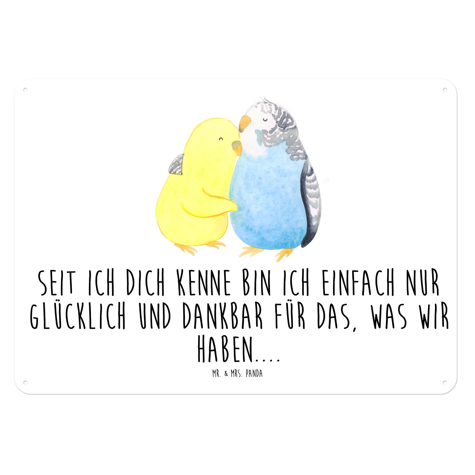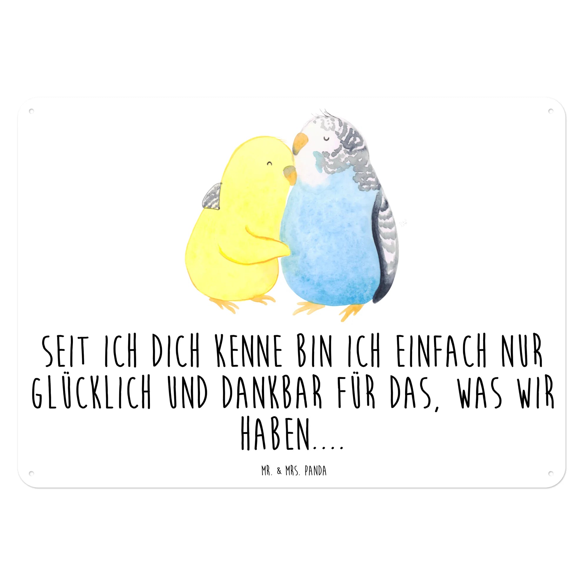 Das Motiv zeigt ein Paar liebender Wellensittiche, die sich kuscheln und ihre Zuneigung zueinander demonstrieren. In sanften Pastellfarben gehalten, vermittelt das Design ein warmes und einladendes Gefühl. Mit dem Slogan "Seit ich dich kenne bin ich einfach nur glücklich und dankbar für das, was wir haben..." spricht das Schild wahrhafte Liebesbotschaften an und ist damit ein ideales Geschenk für alle Verliebten.