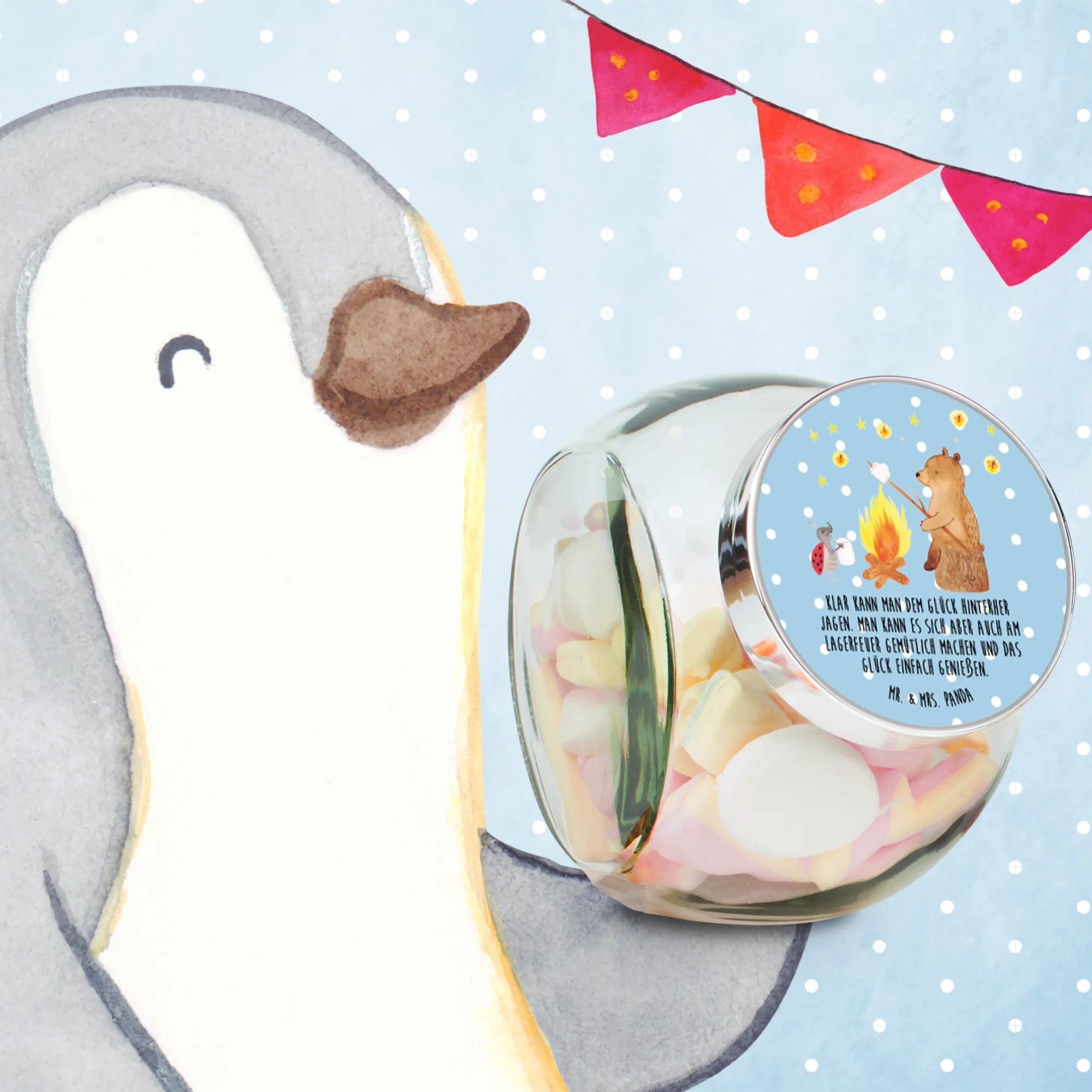 Warum sollte dieses Bonbonglas das ideale Geschenk für deine Liebsten sein? Weil es eine herzliche Botschaft vermittelt. Der Slogan "Klar kann man dem Glück hinterher jagen. Man kann es sich aber auch am Lagerfeuer gemütlich machen und das Glück einfach genießen." bringt die Idee von Entspannung und Freude perfekt auf den Punkt. Die Bär-Kollektion von Mr. & Mrs. Panda ist außerdem perfekt für alle Tierliebhaber und eignet sich sowohl für Groß als auch Klein.