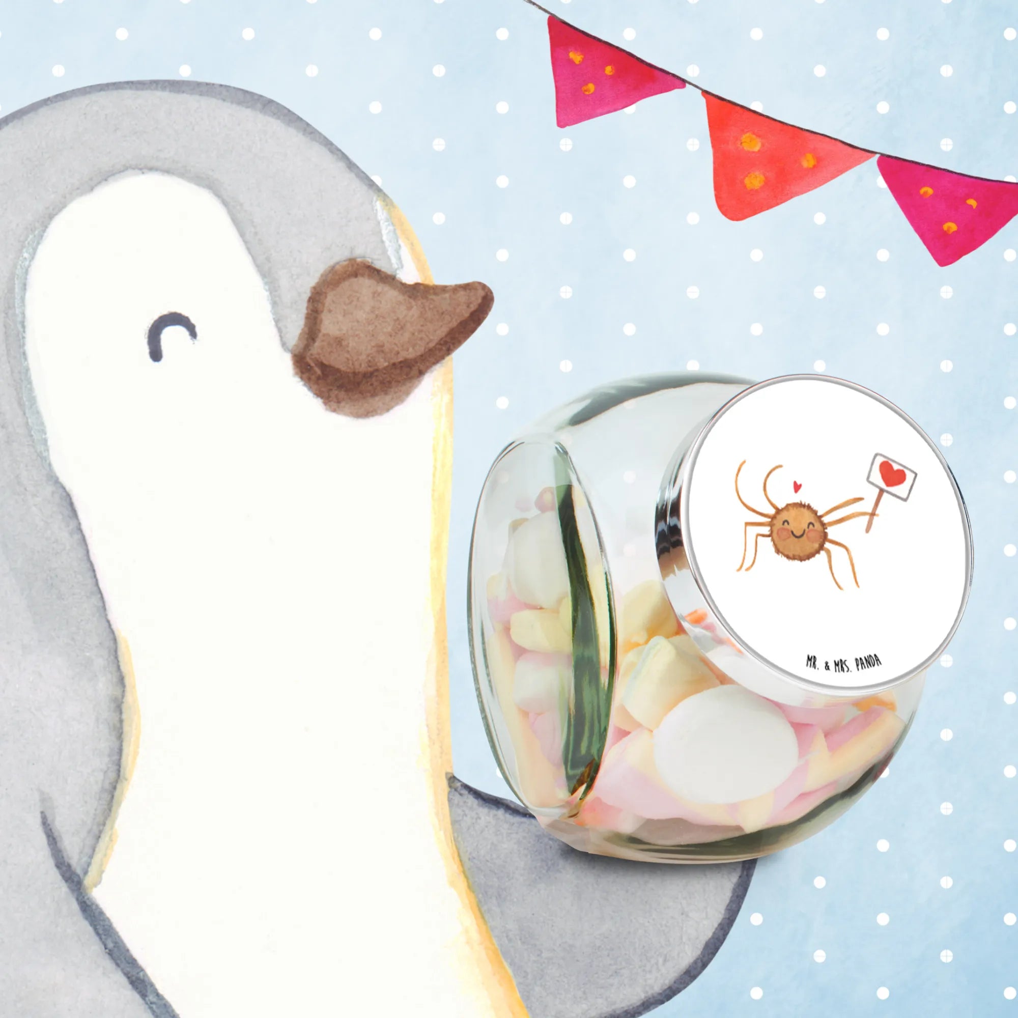 Entdecke das wunderschöne Bonbonglas mit dem niedlichen Motiv der Spinne Agathe, das ausschließlich von Mr. & Mrs. Panda entworfen wurde. Dieses Glas ist nicht nur ein echter Blickfang in deiner Küche, sondern auch extrem praktisch.