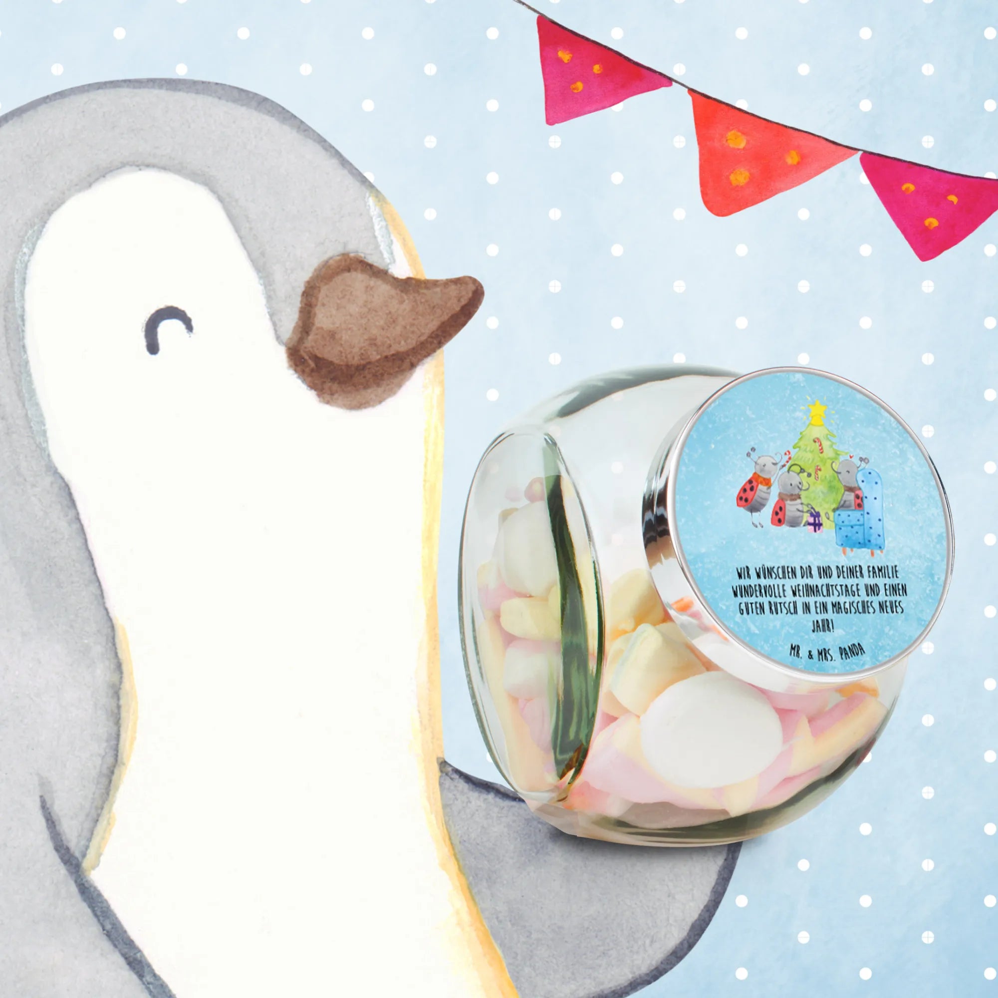 Es eignet sich auch perfekt als kleines Mitbringsel zu Nikolaus oder der Adventszeit. Verschenke Freude und einen Hauch von Weihnachtszauber mit dem Bonbonglas von Mr. & Mrs. Panda – denn wir wünschen dir und deiner Familie wundervolle Weihnachtstage und einen guten Rutsch in ein magisches neues Jahr!