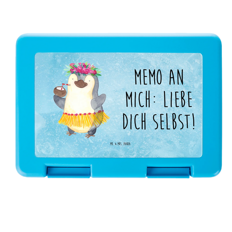 Mr. & Mrs. Panda Brotdose „Pinguin Kokosnuss“ – ein kleiner Urlaub für die Pause. Das handgezeichnete Motiv aus der Pinguin - Kollektion zeigt einen fröhlichen Pinguin mit Kokosnuss und dem liebevollen Slogan „Memo an mich: Liebe dich selbst!“. Ein Design, das gute Laune, Aloha-Feeling und warme Farbnuancen in Eisblau und Blau vereint.