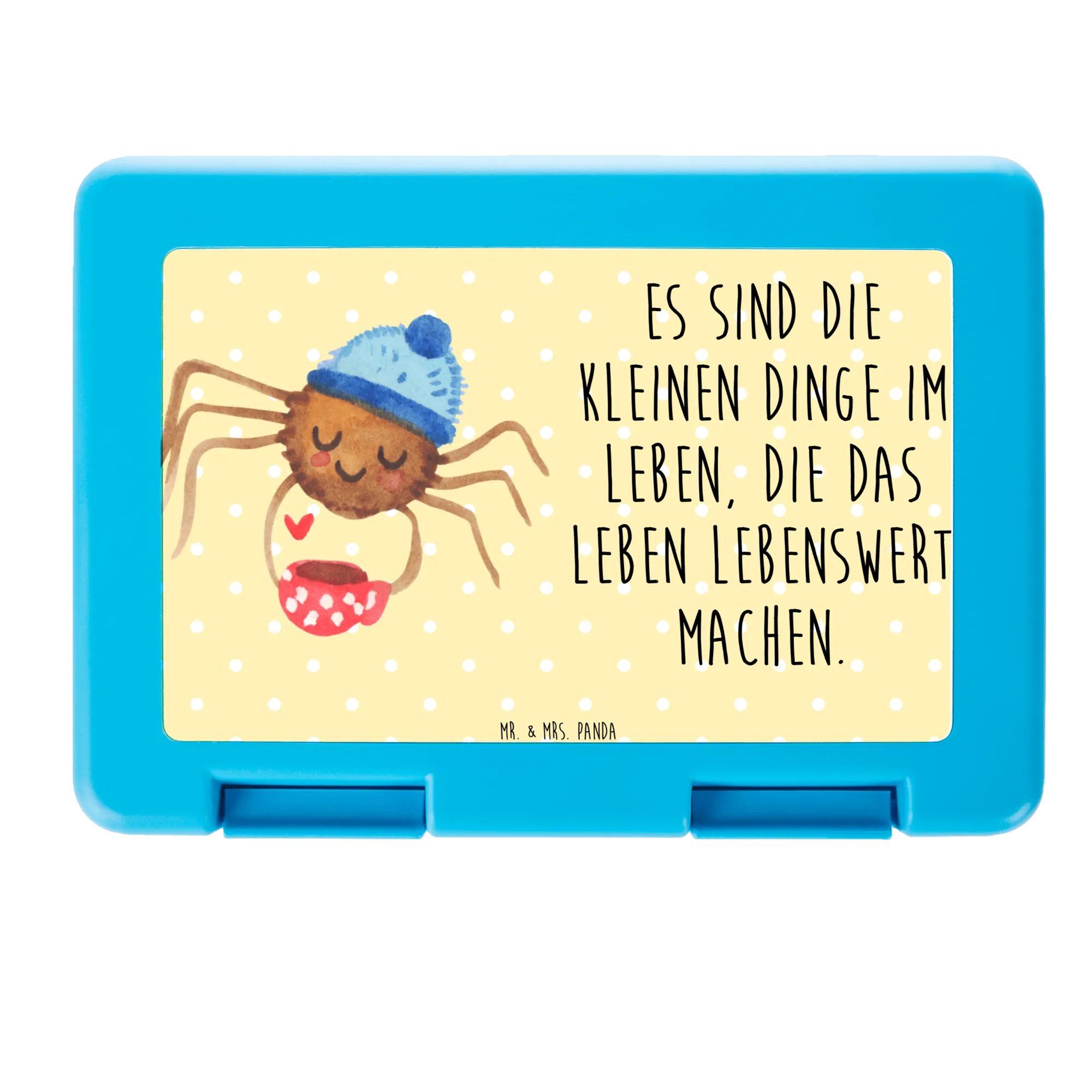 Auf der Suche nach einer Brotdose, die deinen Alltag verschönert? Diese Lunchbox vereint praktischen Nutzen und liebevolles Design. Die niedliche Spinne Agathe mit ihrer Wollmütze und einem Herzchen neben sich trinkt genüsslich Kaffee – begleitet von dem weisen Spruch: Es sind die kleinen Dinge im Leben, die das Leben lebenswert machen.