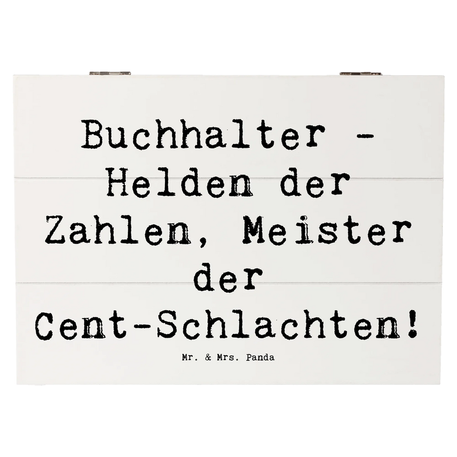 Die wunderschöne Holzkiste "Buchhalter" von Mr. & Mrs. Panda ist das perfekte Geschenk für alle, die im Zahlenraum zu Hause sind. Mit dem liebevollen Spruch "Buchhalter - Helden der Zahlen, Meister der Cent-Schlachten!" wird diese Kiste zum besonderen Blickfang.