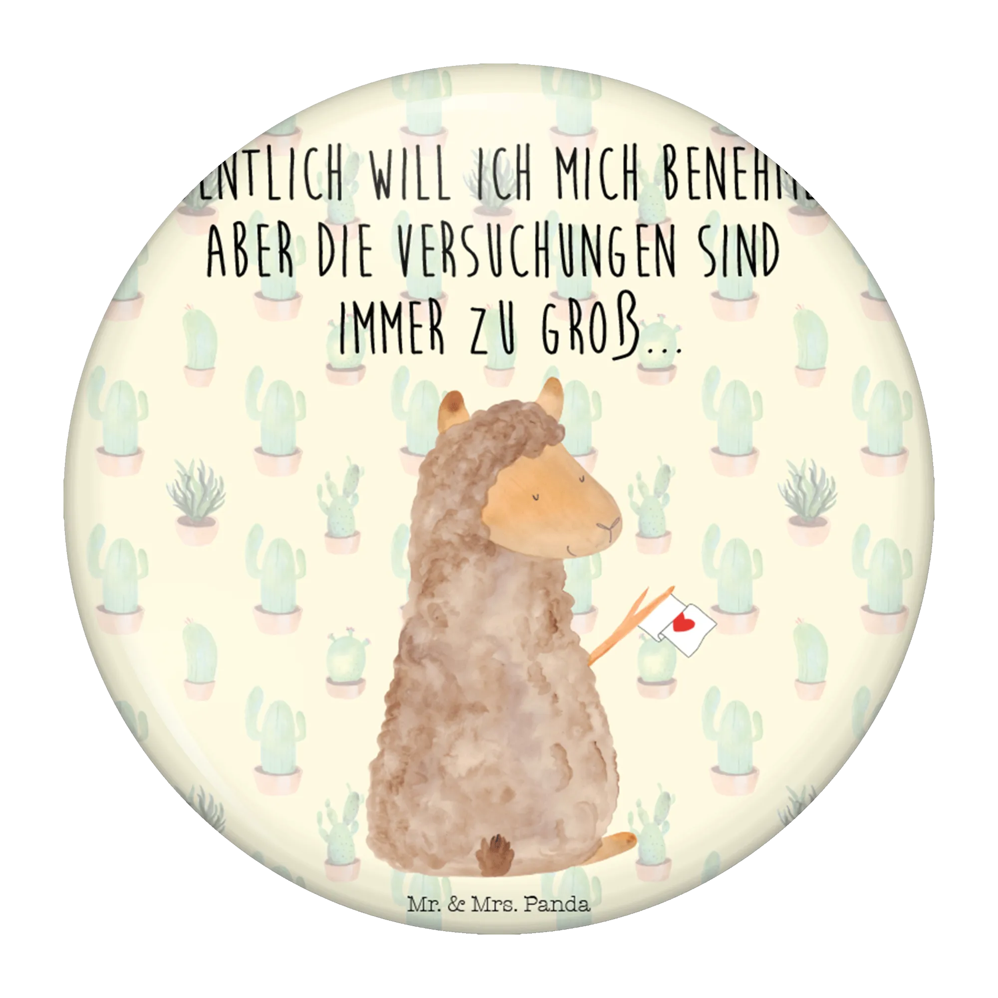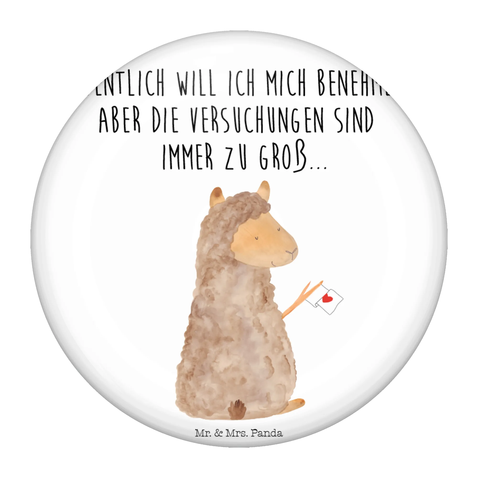 Auch für Veranstaltungen, Messen oder als Dekoration für eine Alpaka-Party ist dieser Button ideal. Zeige, dass Du ein Fan dieser süßen Tiere bist und bringe mit dem Button Spaß in Deinen Alltag. Mit dem Spruch 'Eigentlich will ich mich benehmen, aber die Versuchungen sind immer zu groß.' bringt er ein Lächeln auf die Lippen.