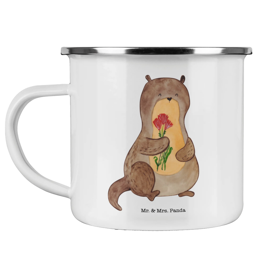 Die wunderschöne Camping Emaille Tasse mit dem fröhlichen Motiv "Otter Blumenstrauß" von Mr. & Mrs. Panda ist das perfekte Geschenk für alle Outdoor-Liebhaber und Otter-Fans! Hält der süße Otter, der einen bunten Blumenstrauß in den Pfoten hält, nicht einfach jeden im Bann?