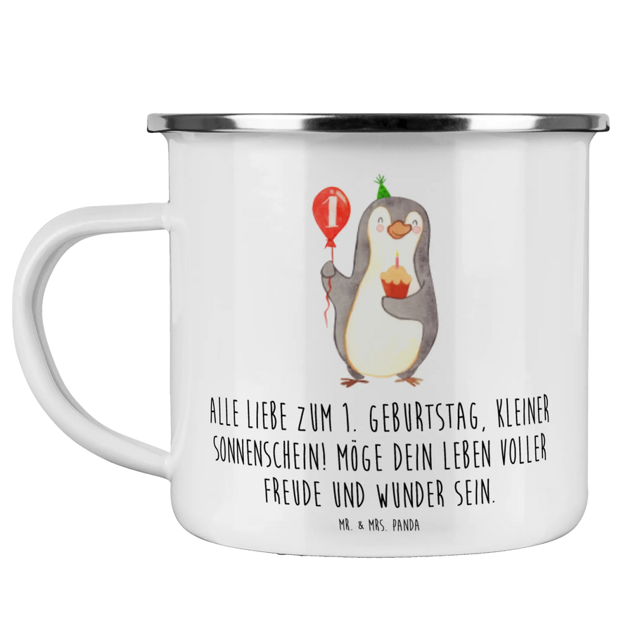 Mr. & Mrs. Panda Camping Emaille Tasse – 1. Geburtstag