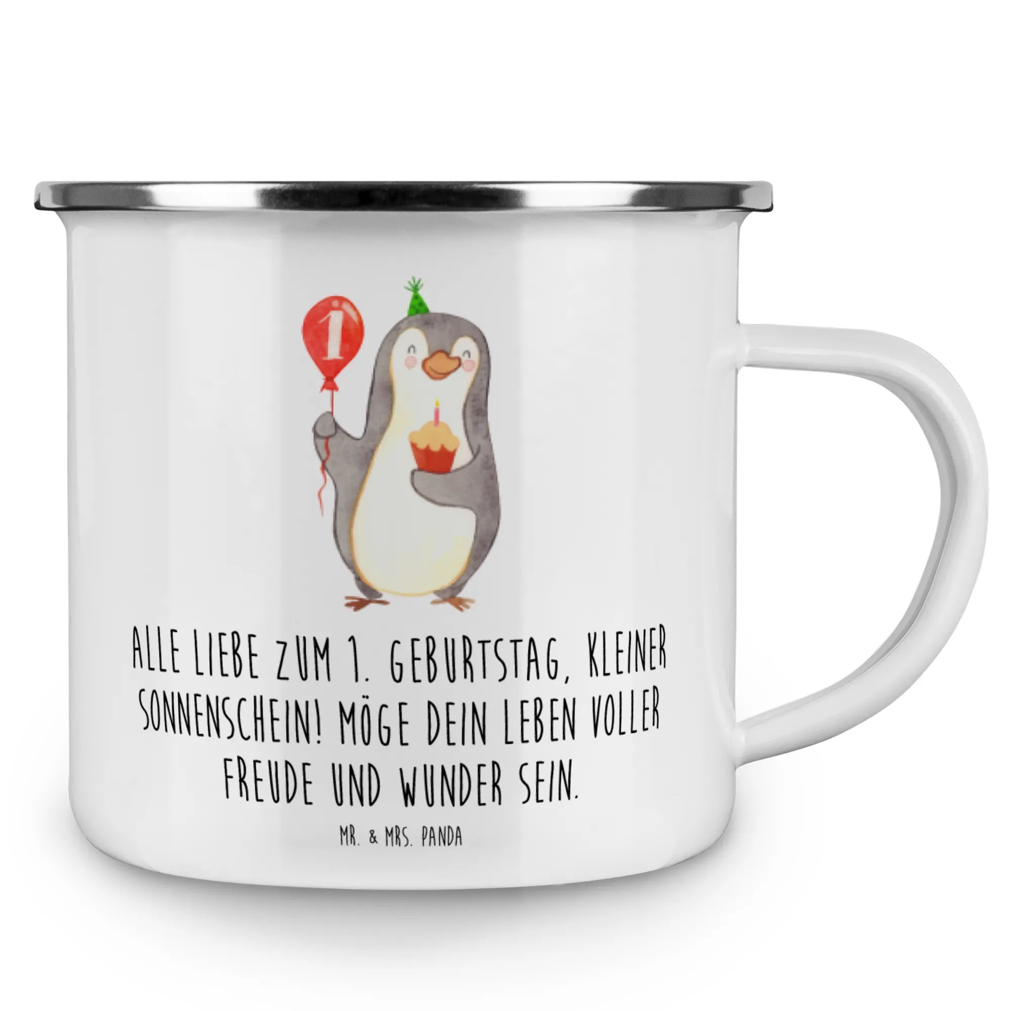 Diese zauberhafte Emaille Tasse trägt den liebevollen Spruch: „Alle Liebe zum 1. Geburtstag, kleiner Sonnenschein! Möge dein Leben voller Freude und Wunder sein.“ Ein Motiv aus unserer Geburtstagskollektion, handgezeichnet von Mrs. Panda, das Wärme, Freude und Geborgenheit schenkt.
