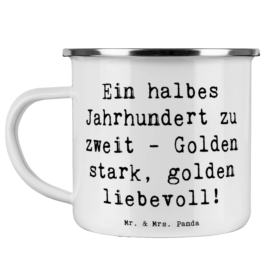 Die wunderschöne Camping Emaille Tasse "50. Hochzeitstag Goldene Hochzeit" von Mr. & Mrs. Panda ist das perfekte Geschenk für Paare, die ein halbes Jahrhundert voller Liebe und gemeinsamer Erinnerungen feiern möchten. Mit ihrem bezaubernden Design und dem einprägsamen Spruch "Ein halbes Jahrhundert zu zweit - Golden stark, golden liebevoll!" wird diese Tasse zum echten Highlight auf jeder Feier.