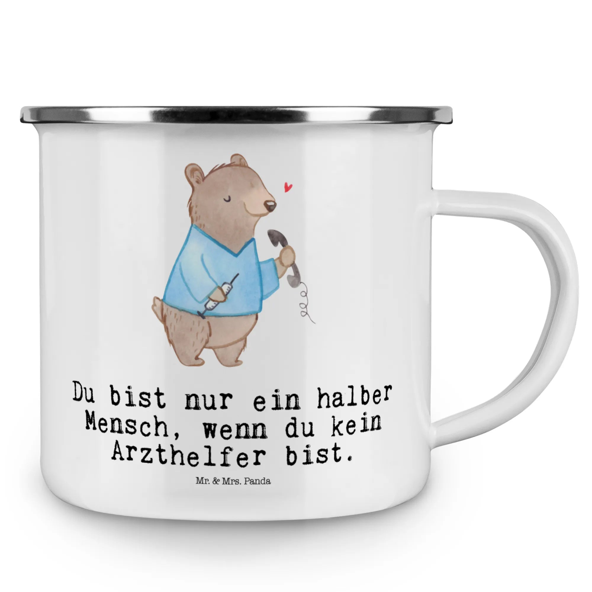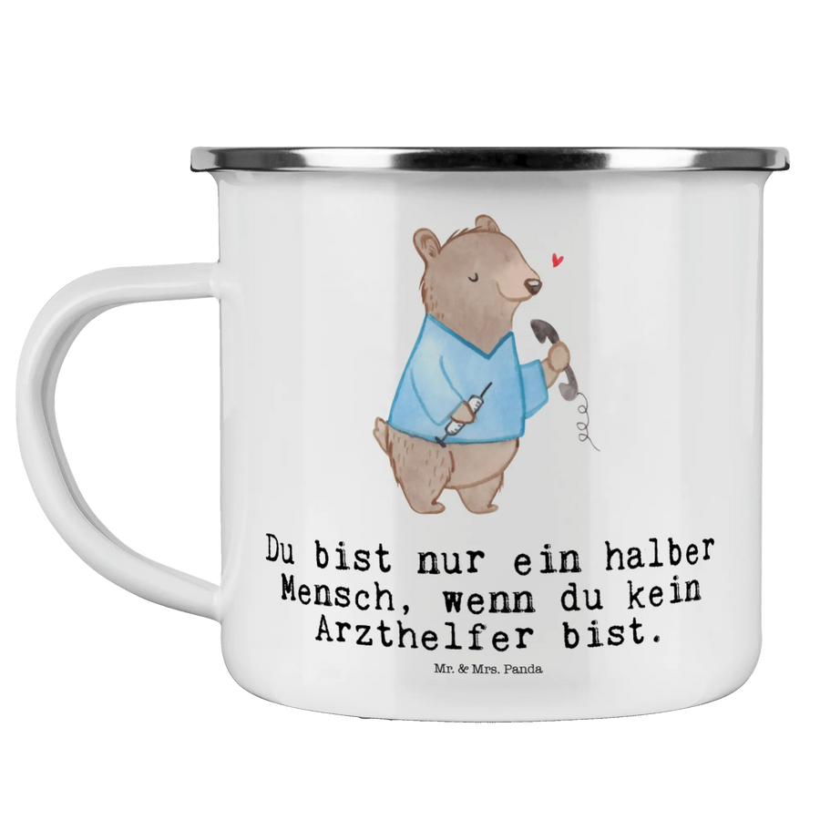 Die Camping Emaille Tasse "Arzthelfer mit Herz" von Mr. & Mrs. Panda ist das perfekte Geschenk für alle, die in der medizinischen Welt tätig sind. Ob als Dankeschön für einen geschätzten Kollegen oder als kleines Präsent zum Berufsabschluss, diese Tasse bringt ein Lächeln ins Gesicht! Ihr praktisches und funktionelles Design macht sie ideal für alle, die viel unterwegs sind und nicht auf ihren Kaffee oder Tee verzichten möchten.