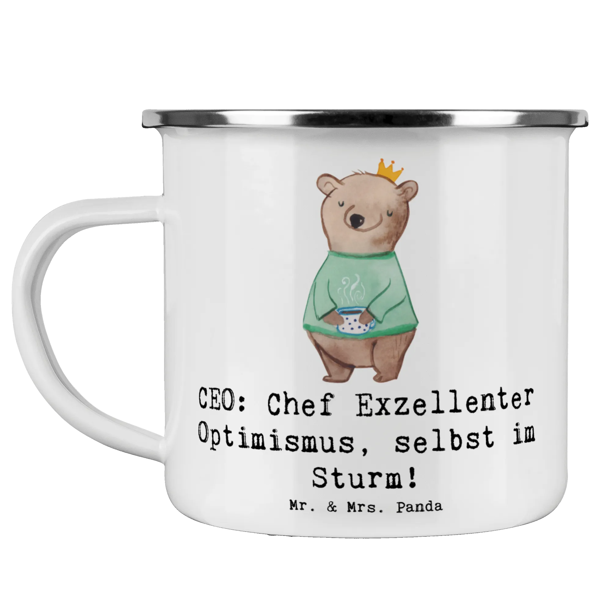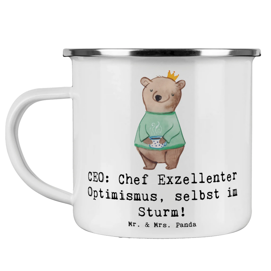 Die Camping Emaille Tasse "CEO: Chef Exzellenter Optimismus, selbst im Sturm!" von Mr. & Mrs. Panda ist das perfekte Geschenk für all jene, die in der Geschäftswelt tätig sind. Egal, ob du eine Führungskraft bist oder jemanden in deinem Umfeld kennst, der diesen Weg beschreitet, diese Tasse spricht das Herz eines jeden CEOs an und hat gleichzeitig einen praktischen Nutzen.