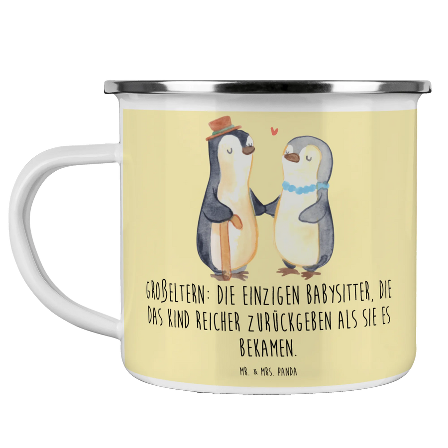 Die Camping Emaille Tasse von Mr. & Mrs. Panda ist das perfekte Geschenk für Großeltern, die ihre Enkelkinder lieben. Mit dem hübschen Slogan „Großeltern: die einzigen Babysitter, die das Kind reicher zurückgeben als sie es bekamen“ wird diese Tasse zu einem echten Hingucker.
