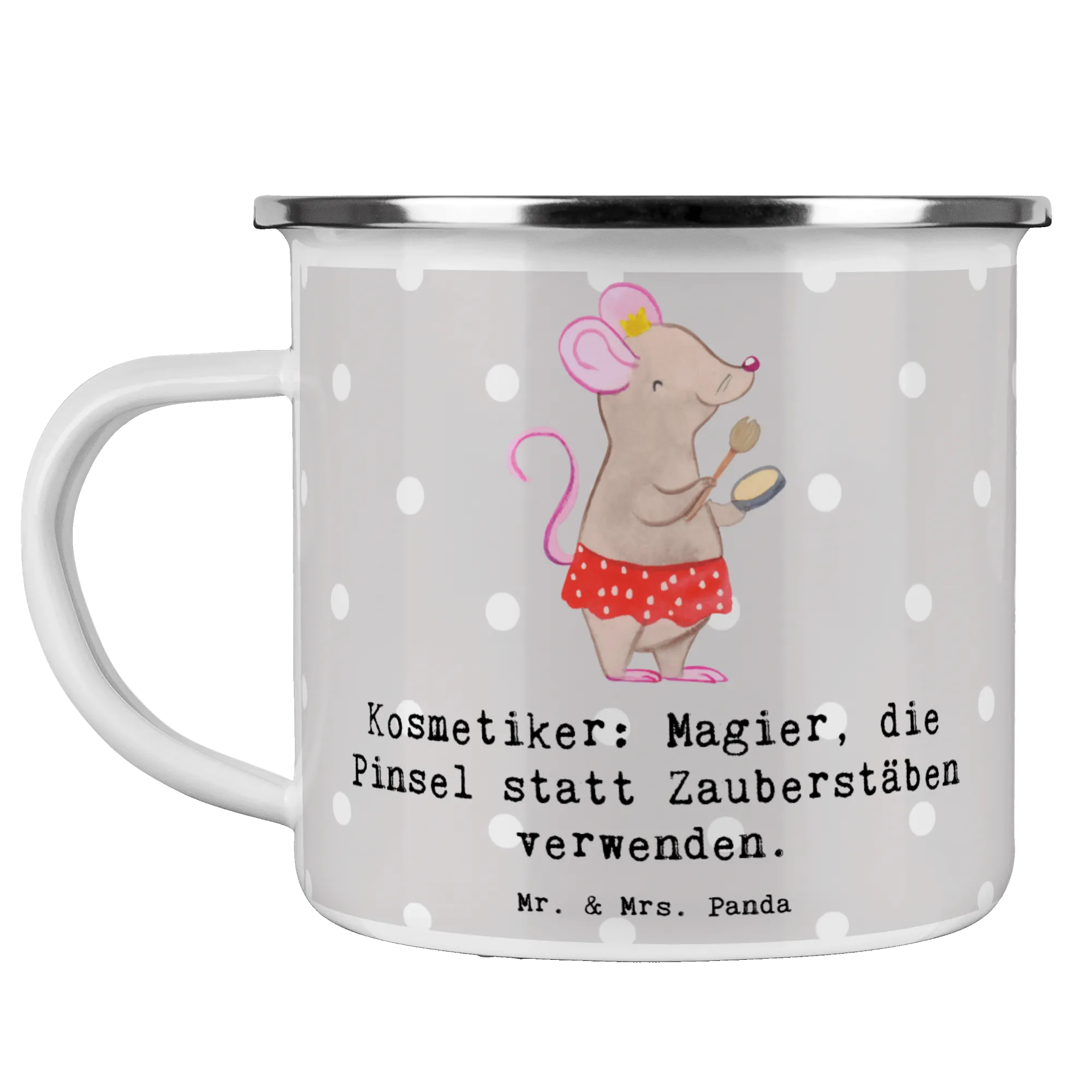 Die wunderschöne Camping Emaille Tasse von Mr. & Mrs. Panda ist das perfekte Geschenk für alle Kosmetiker und Fans der kreativen Berufe. Mit ihrem liebevollen Design und dem Spruch "Kosmetiker: Magier, die Pinsel statt Zauberstäben verwenden" ist sie nicht nur ein praktisches Accessoire für Outdoor-Abenteuer, sondern auch eine tolle Möglichkeit, Wertschätzung für die einzigartige Arbeit von Kosmetikern zu zeigen.