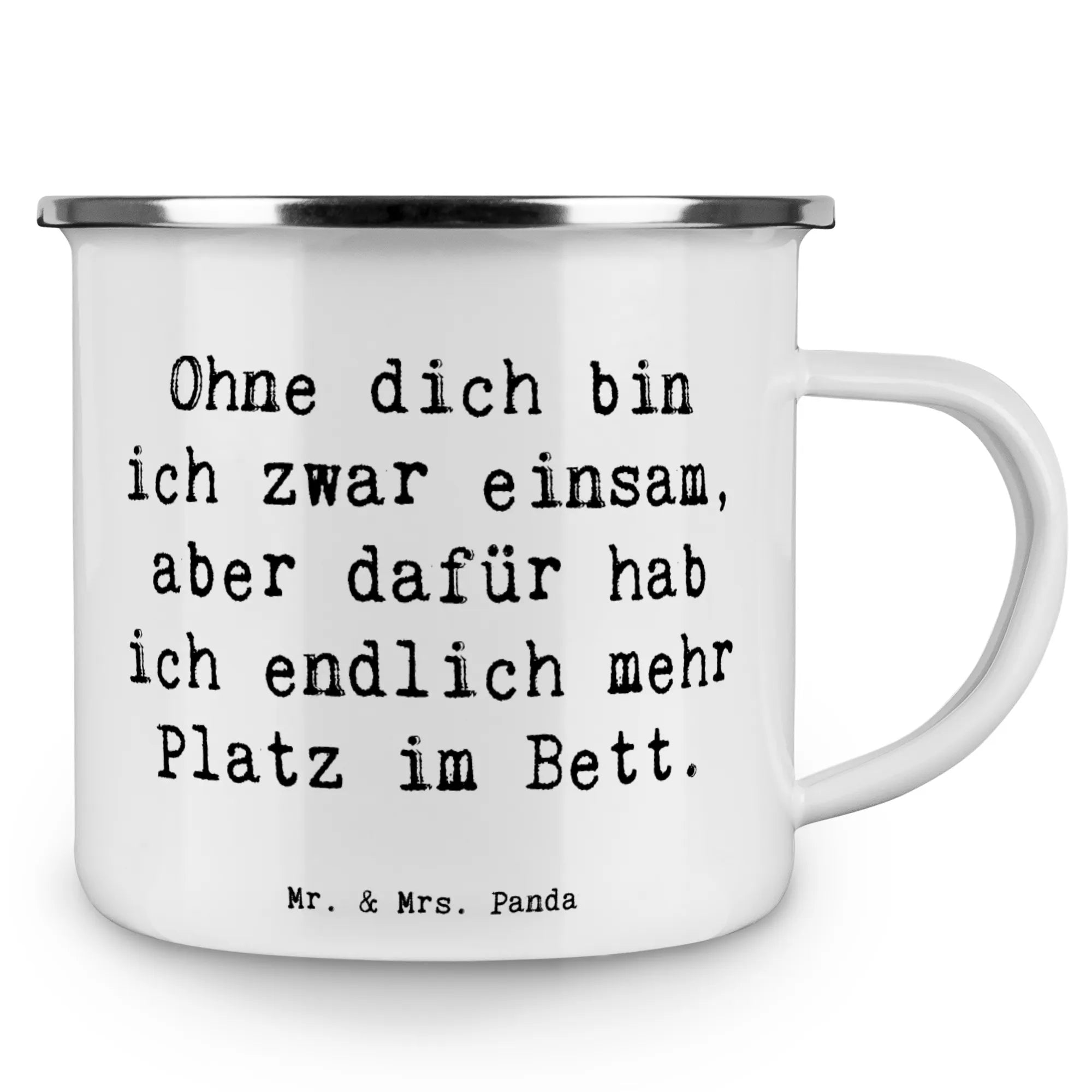 Die Camping Emaille Tasse Liebeskummer von Mr. & Mrs. Panda ist das perfekte Geschenk für all jene, die eine herzerwärmende Botschaft schätzen und gleichzeitig die Vorteile eines praktischen Outdoor-Produkts nutzen wollen. Diese wunderschöne und beständige Tasse bringt mit ihrem einzigartigen Spruch "Ohne dich bin ich zwar einsam, aber dafür hab ich endlich mehr Platz im Bett" ein bisschen Humor und Trost in harte Zeiten. Egal, ob beim Camping, Wandern oder einfach nur beim Entspannen im Garten, mit ihrer robusten Beschaffenheit ist diese Metalltasse für Kaffee und andere Getränke ideal geeignet.