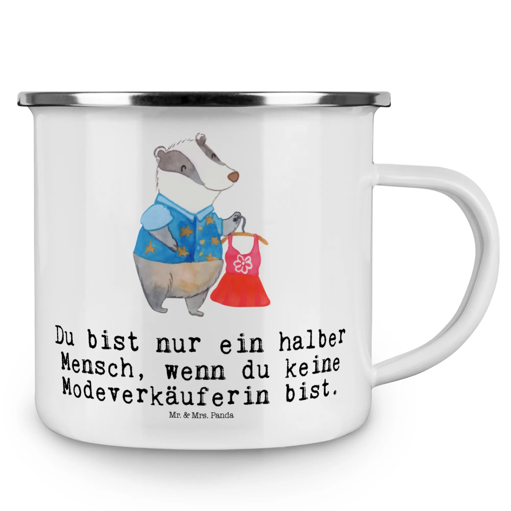 Entdecke die zauberhafte Camping Emaille Tasse mit dem Motiv "Modeverkäuferin mit Herz" von Mr. & Mrs. Panda! Diese Tasse ist nicht nur ein geschmackvolles Accessoire für echte Modeverkäuferinnen, sondern auch ein praktischer Begleiter für alle Outdoor-Abenteuer.