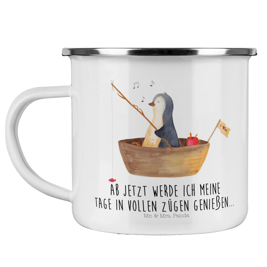 Du bist auf der Suche nach dem perfekten Geschenk für einen Pinguinliebhaber oder jemanden, der gerne Zeit in der Natur verbringt? Dann ist die Camping Emaille Tasse mit dem süßen Pinguin auf dem Angelboot aus der Pinguin - Kollektion von Mr. & Mrs. Panda genau das Richtige für dich! Diese wunderschöne und beständige Camping Emaille Tasse bringt nicht nur Freude, sondern auch eine Portion Motivation in jeden Outdoor-Ausflug.