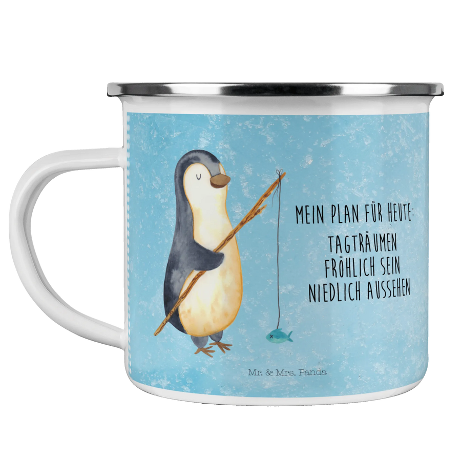 Diese wunderbare und beständige Camping Emaille Tasse begeistert durch ihr schönes Design: Ein fröhlicher Pinguin mit einer Angel in der Hand, umgeben von sanften Aquarellfarben, die für eine leichte und entspannende Atmosphäre sorgen. Mit dem charmanten Slogan 'Mein Plan für heute: Tagträumen, fröhlich sein & niedlich aussehen' bringt diese Tasse genau das richtige Maß an Lebensfreude mit.