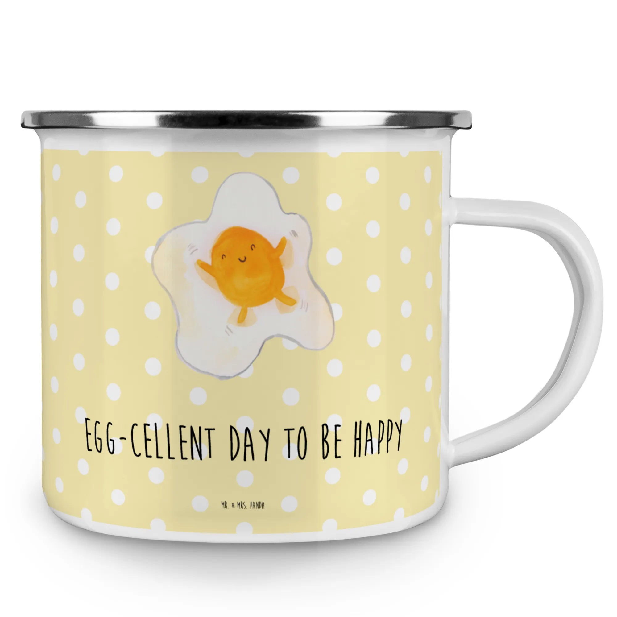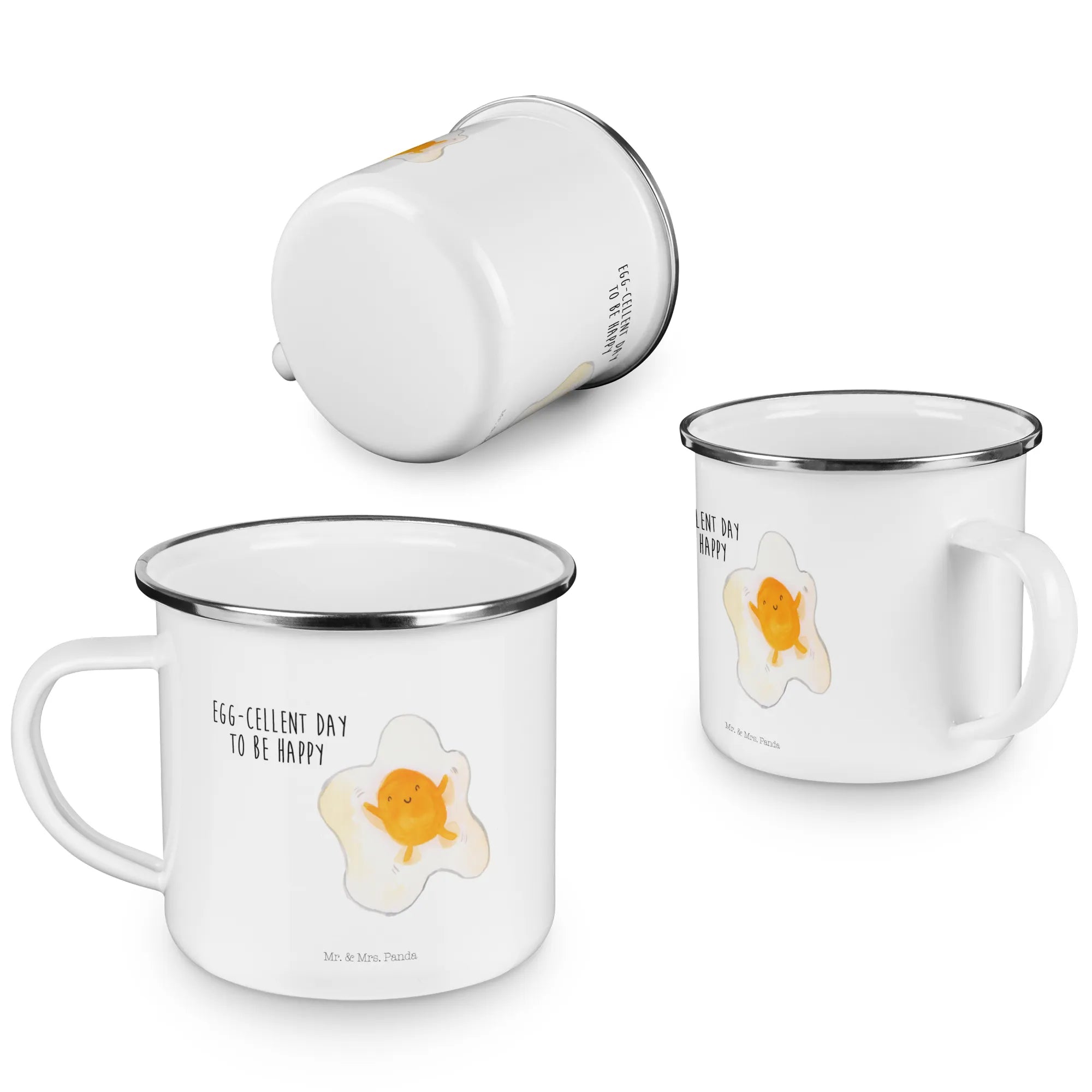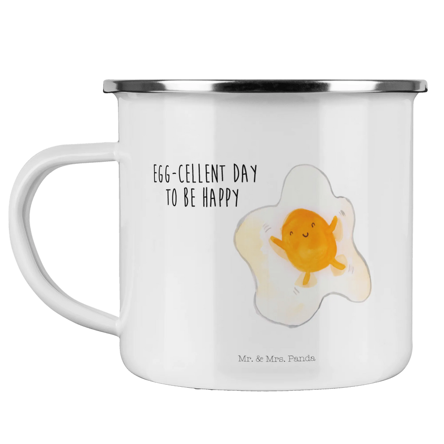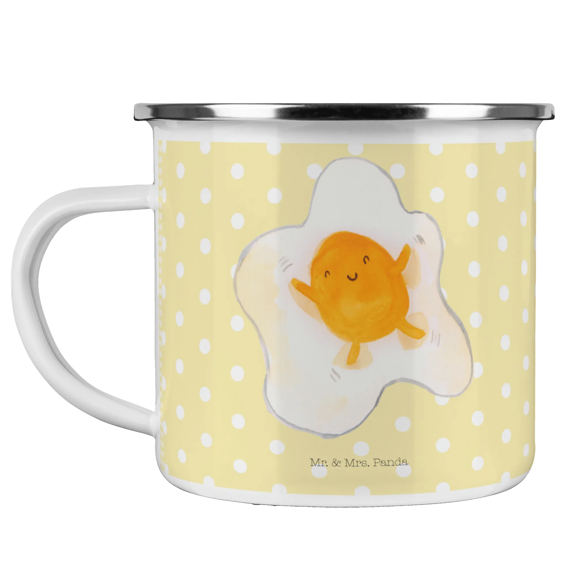 Die Camping Emaille Tasse von Mr. & Mrs. Panda mit dem bezaubernden Motiv eines Spiegeleis ist das perfekte Geschenk für alle Outdoor-Enthusiasten und Camping-Liebhaber!