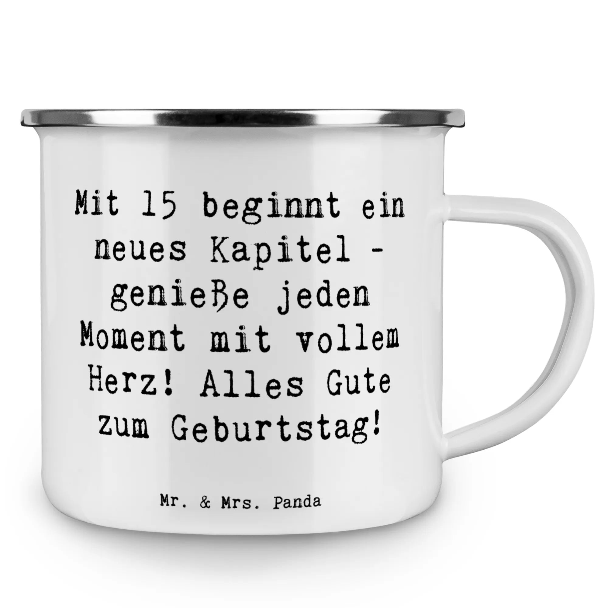 Entdecke die perfekte Camping Emaille Tasse für den 15. Geburtstag! Diese wundervolle und langlebige Tasse von Mr. & Mrs. Panda kombiniert Funktionalität mit einem herzlichen Spruch, der dem Geburtstagskind unvergessliche Momente, spannende Abenteuer und die besten Freundschaften fürs Leben wünscht.