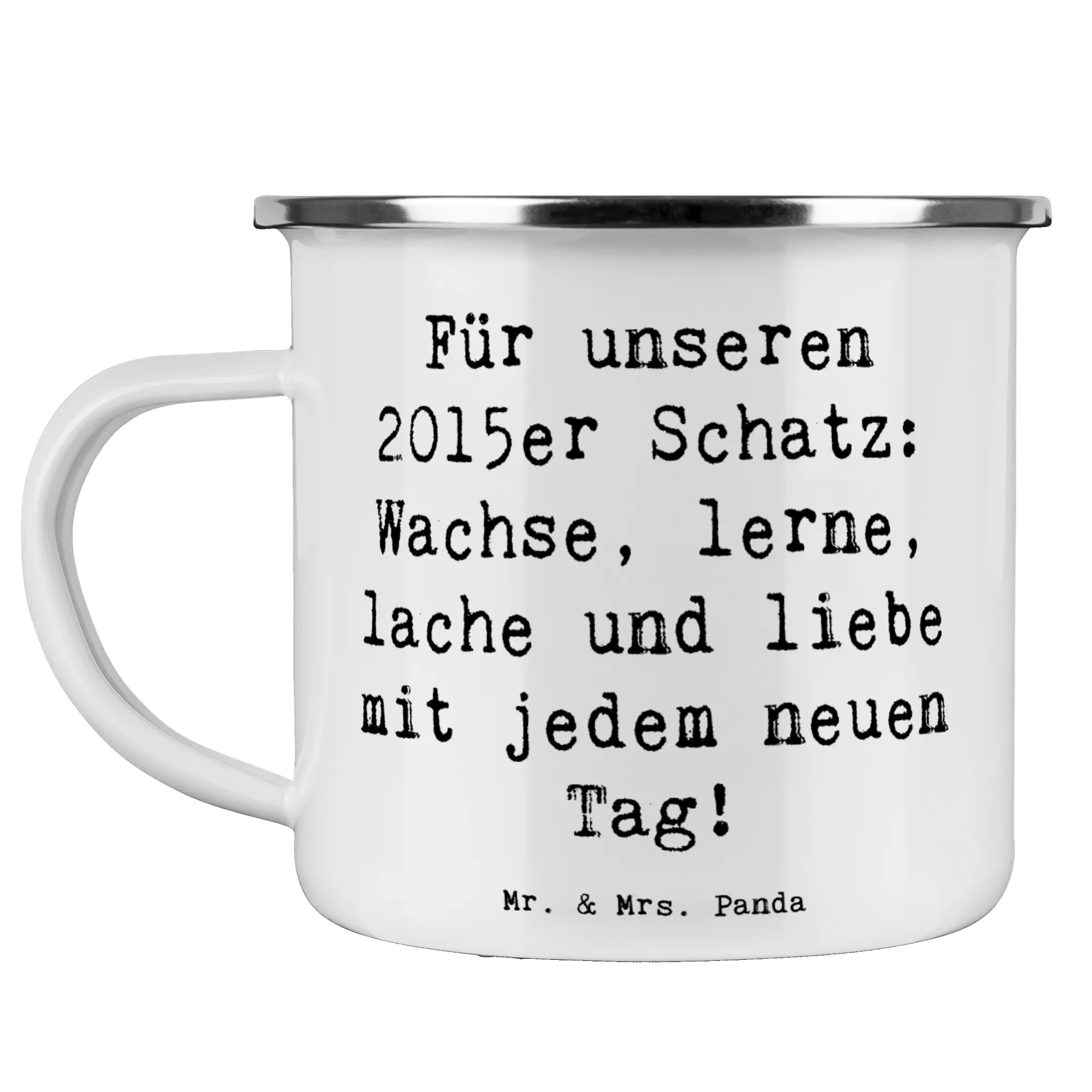 Die Camping Emaille Tasse mit dem besonderen Motiv "2015 Geburtstag" von Mr. & Mrs. Panda ist das perfekte Geschenk für alle, die jemanden feiern wollen, der 2015 geboren wurde! Diese liebevoll gestaltete Tasse bringt nicht nur Freude, sondern auch besondere Erinnerungen.