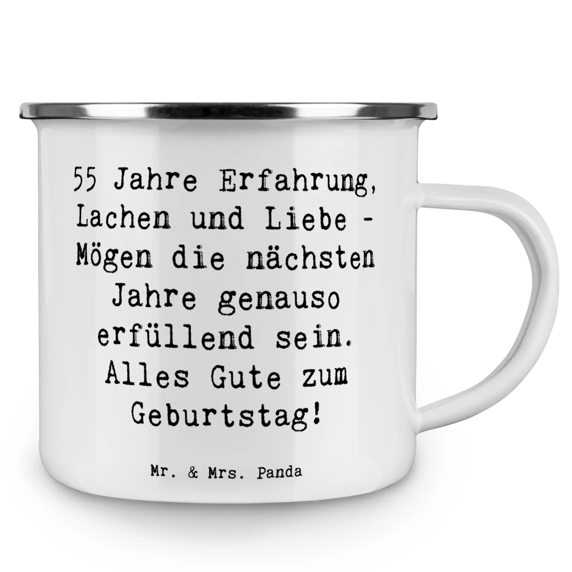 Die Camping Emaille Tasse von Mr. & Mrs. Panda ist das perfekte Geschenk für jeden, der seinen 55. Geburtstag feiert! Mit ihrem einzigartigen Motiv, das "55 Jahre Erfahrung, Lachen und Liebe - Mögen die nächsten Jahre genauso erfüllend sein. Alles Gute zum Geburtstag!" verkörpert, ist sie mehr als nur ein einfacher Trinkbecher.