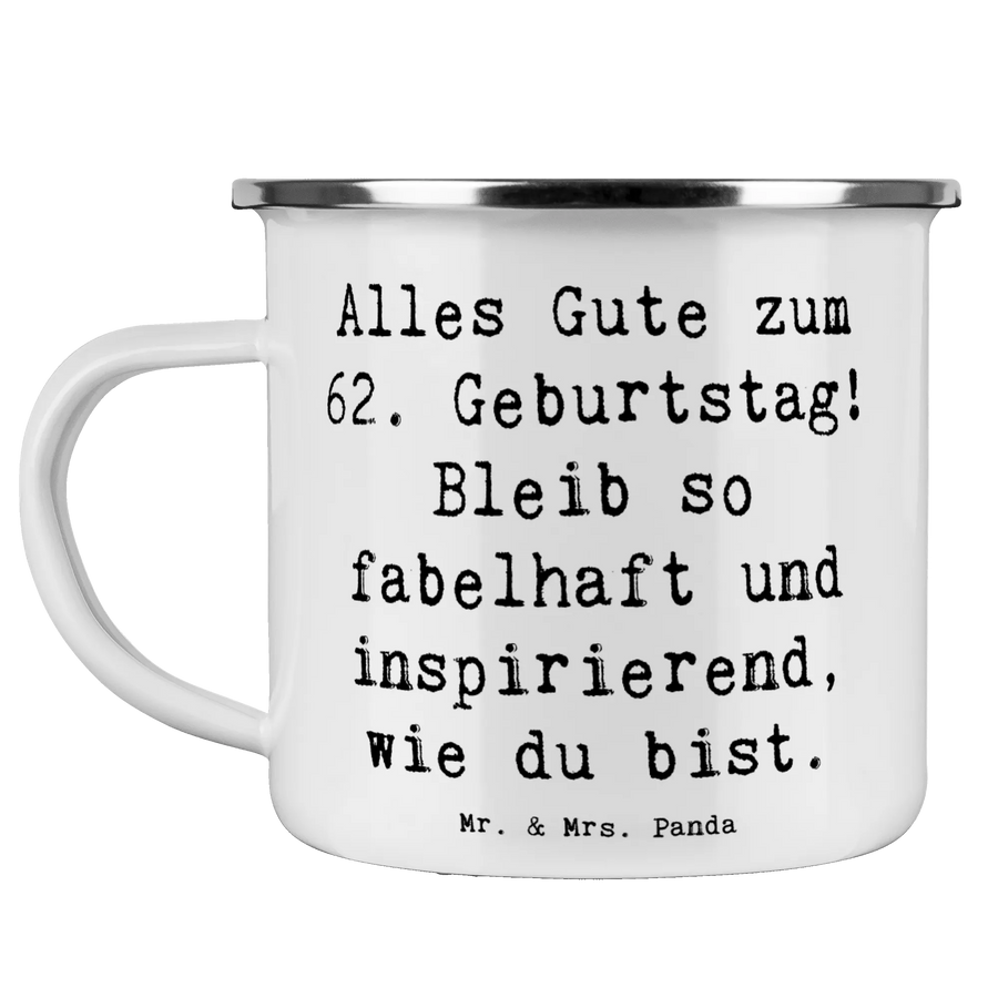 Die Camping Emaille Tasse zum 62. Geburtstag von Mr. & Mrs. Panda ist das perfekte Geschenk für alle, die ihren besonderen Tag gerne in der Natur feiern! Diese Tasse wird nicht nur mit dem liebevollen Spruch "Alles Gute zum 62. Geburtstag! Bleib so fabelhaft und inspirierend, wie du bist." bedruckt, sondern vereint auch eine funktionale Nutzung mit einem stilvollen Design.
