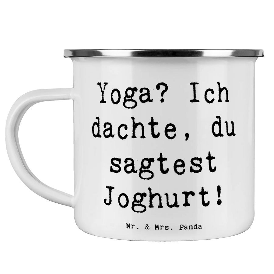 Entdecke die perfekte Camping Emaille Tasse mit dem süßen Motiv "Yoga? Ich dachte, du sagtest Joghurt!" von Mr. & Mrs. Panda. Diese robuste Tasse ist nicht nur ein echter Hingucker, sondern ideal für alle Sportbegeisterte und Outdoor-Fans, die ihre Liebe zu Yoga auf eine charmante und humorvolle Weise zeigen möchten.