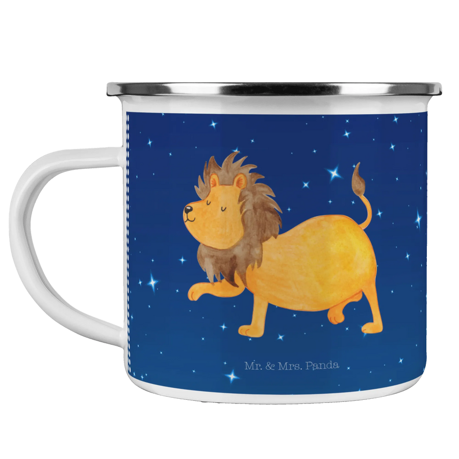 Die Camping Emaille Tasse mit dem wunderbaren Motiv des Sternzeichens Löwe von Mr. & Mrs. Panda ist das perfekte Geschenk für tierliebende Abenteurer! Sie ist nicht nur superbequem, sondern auch äußerst praktisch für jede Wanderung oder jedes Campingabenteuer.
