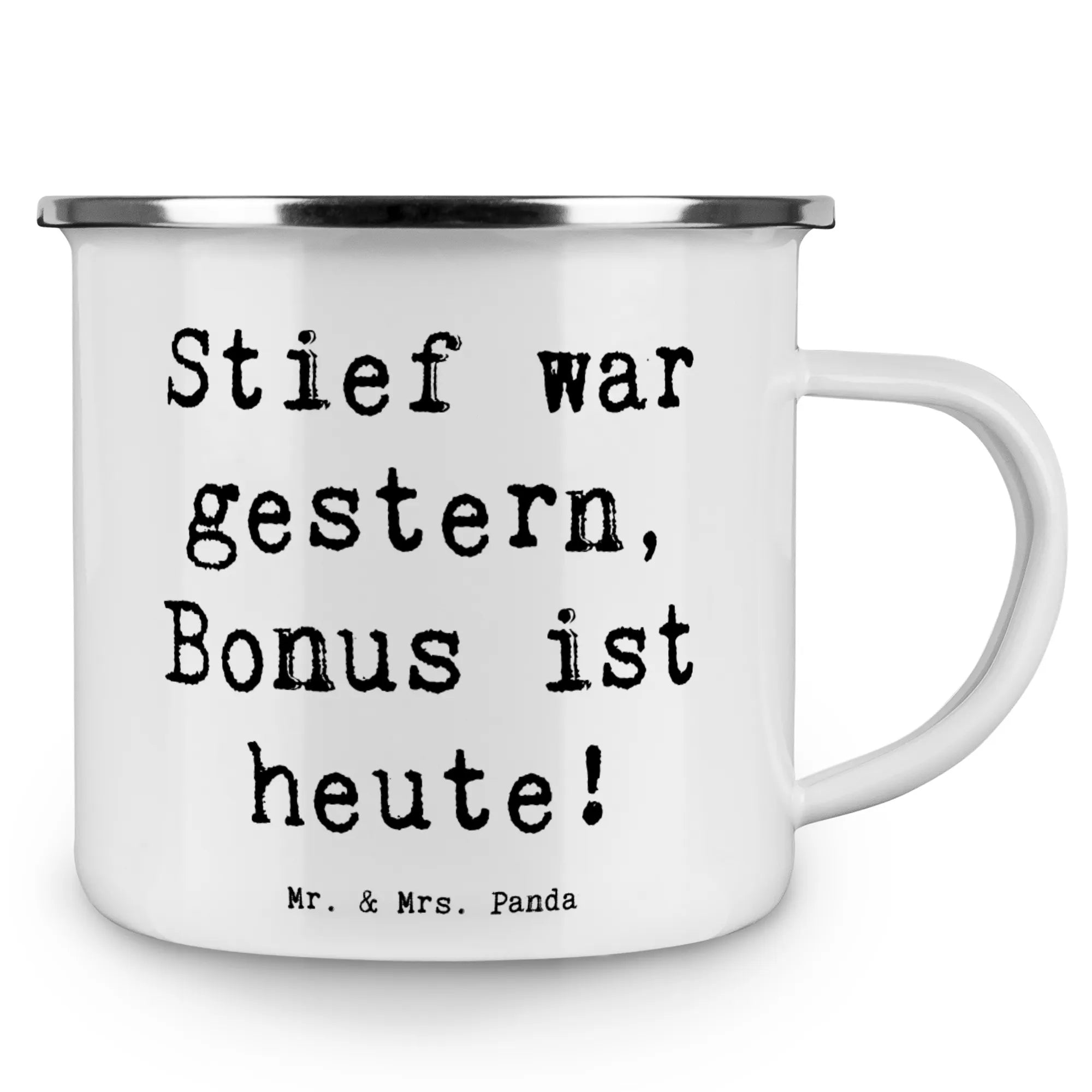Entdecke die bezaubernde Camping Emaille Tasse mit dem Spruch "Stief war gestern, Bonus ist heute!" von Mr. & Mrs. Panda – der perfekte Begleiter für alle Outdoor-Abenteuer!
